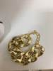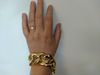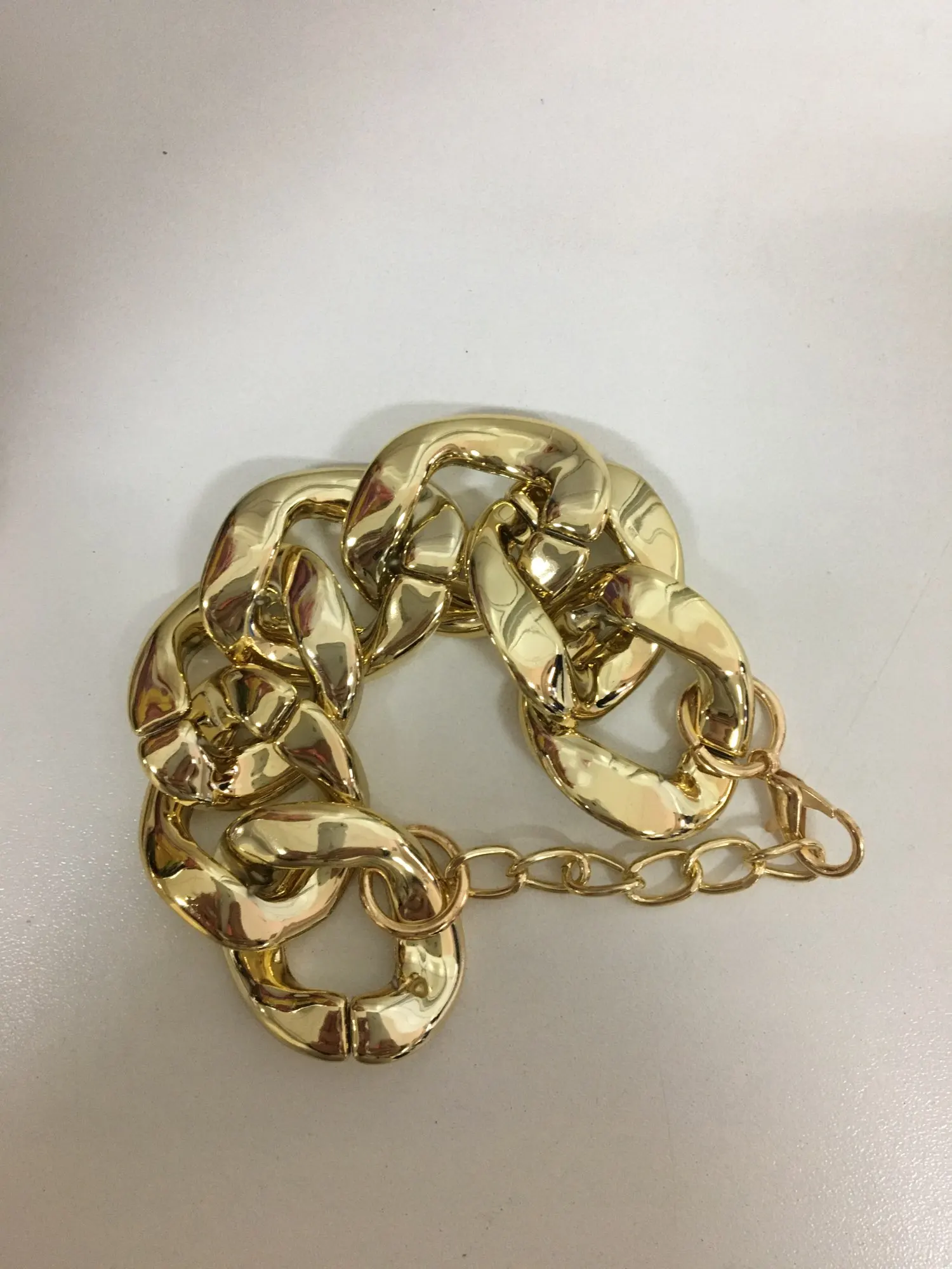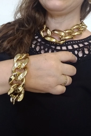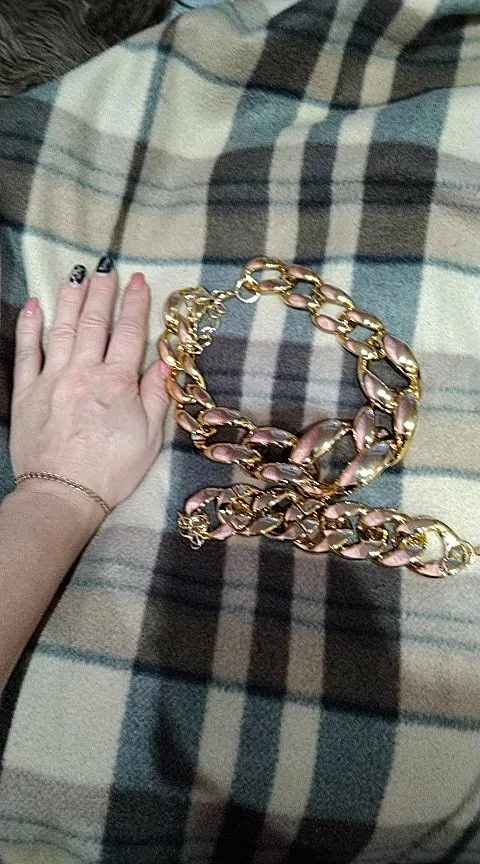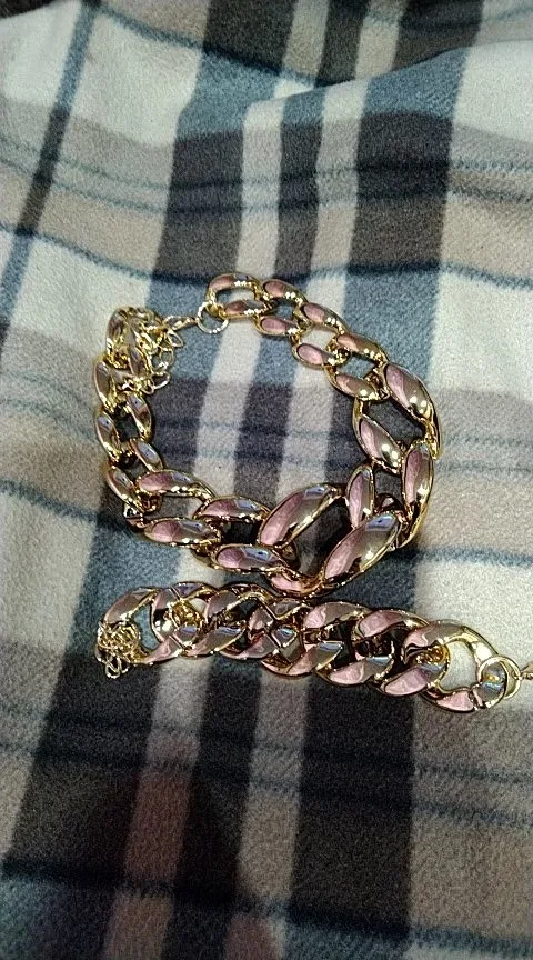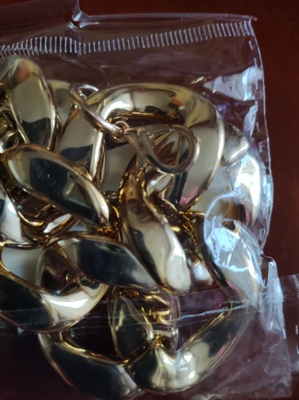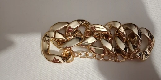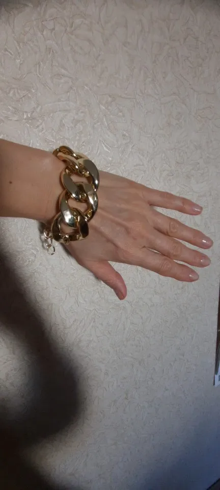 The bracelet is beautiful, plastic, with a golden coating. Looks good. Thanks to the store for sending the goods.
