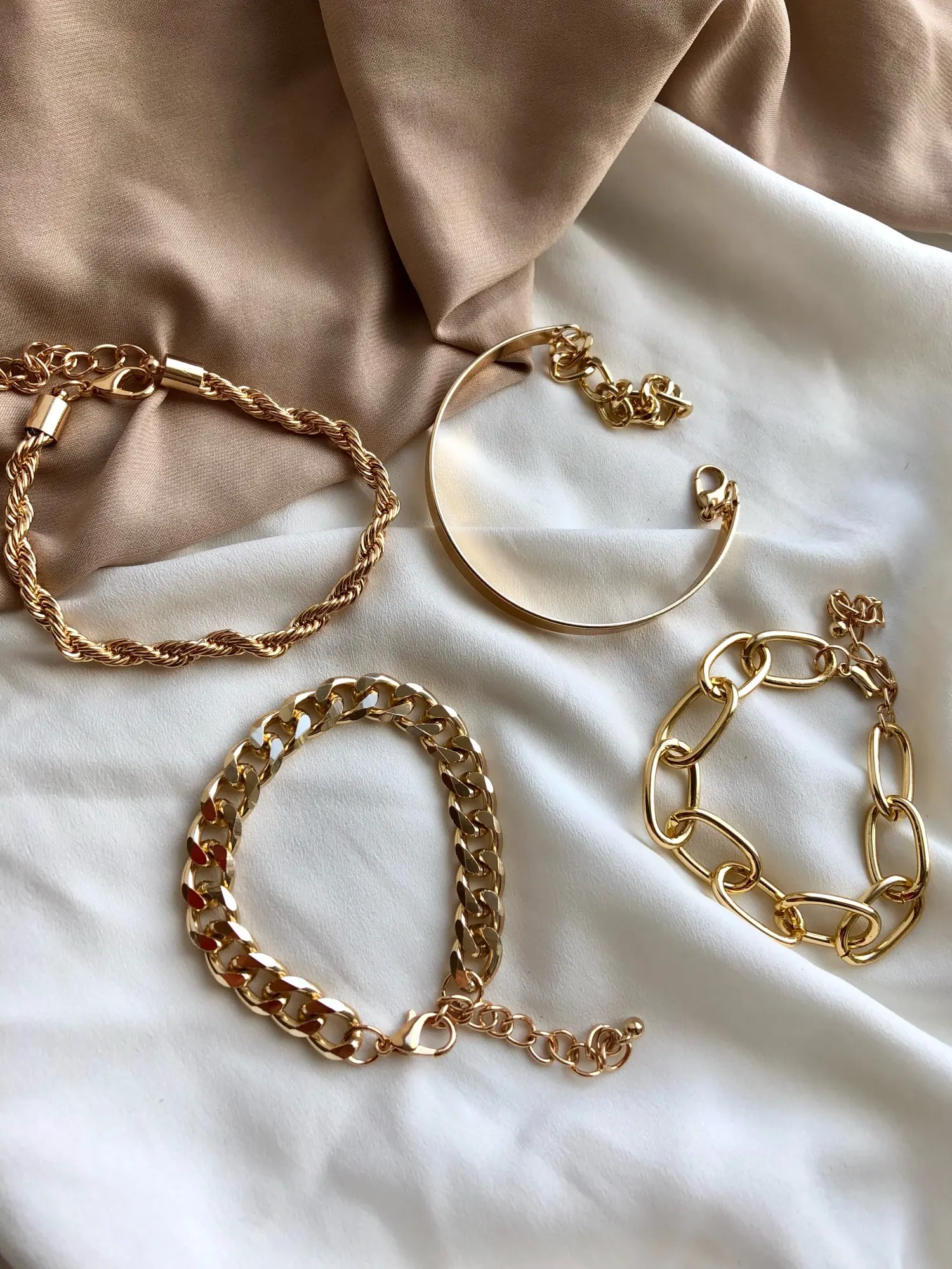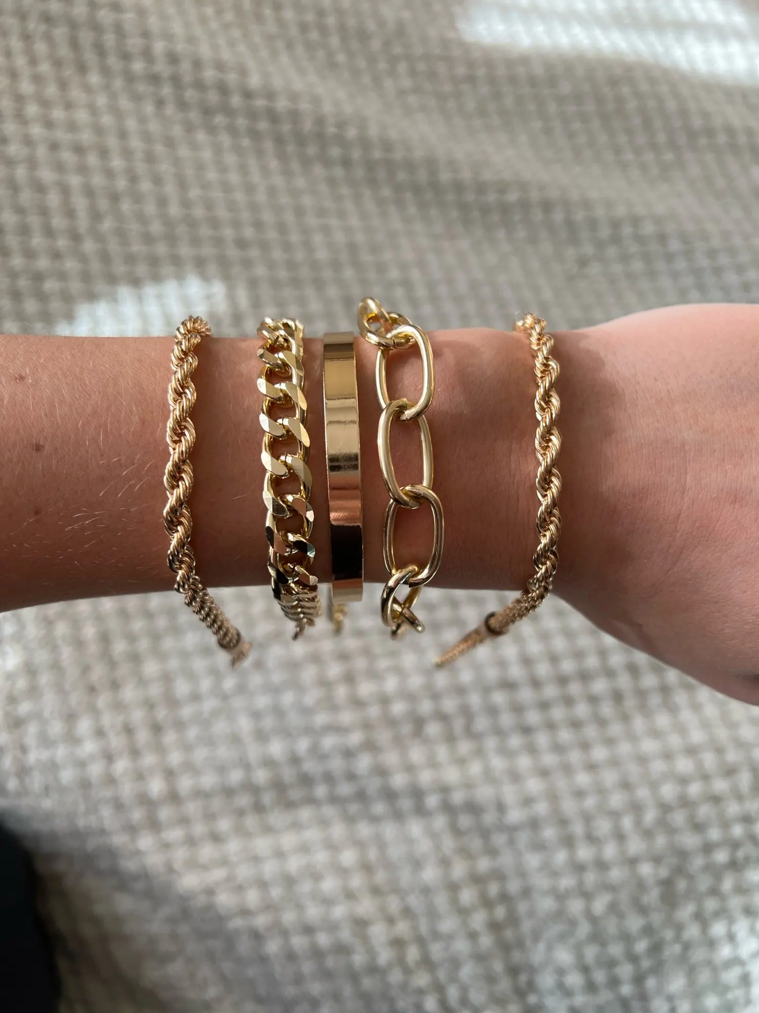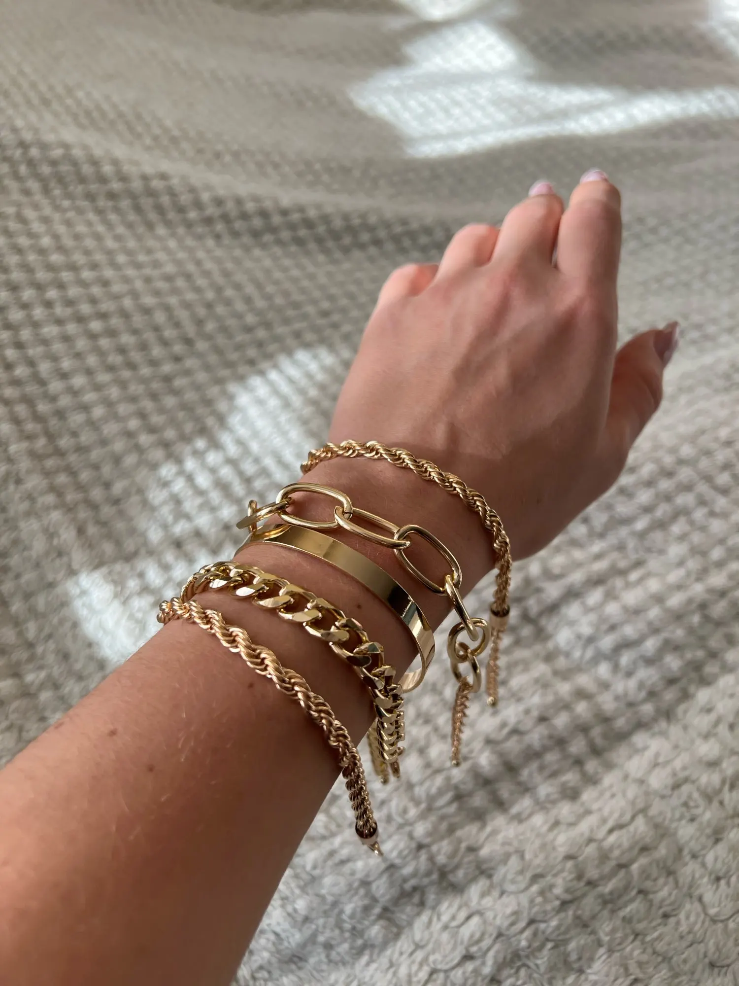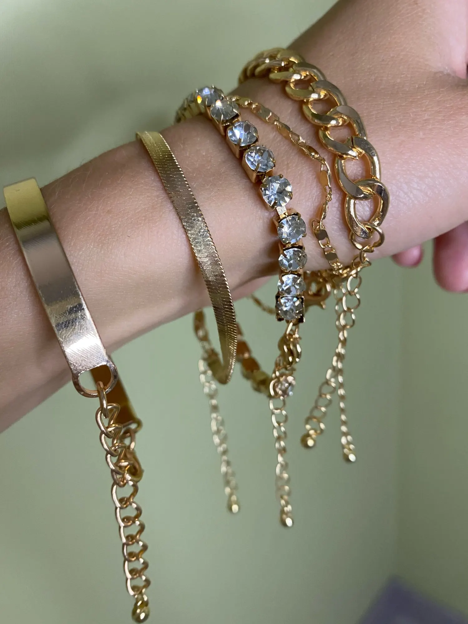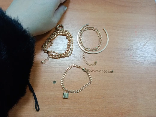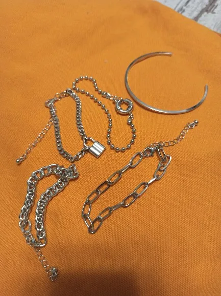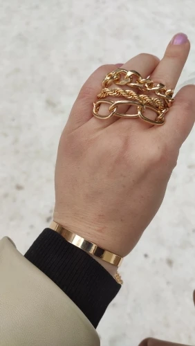 Very cool set in which comes immediately 5 bracelets on hand! All bracelets are different: Chains of different weaving and thickness! I chose gold in color, but the store has many different combinations of bracelets in different metal color! On the bracelets there are chains-adapters, so they will fit any size of the hand!