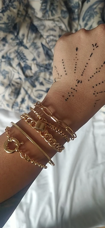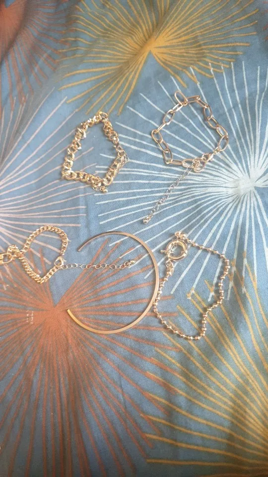 mi piacciono questi braccialetti ! non pensavo sarebbero stato così piccoli perché di solito anche quelli da donna sono comunque eccessivamente lunghi e siccome ho un polso molto piccolo , sono stata molto contenta (anche se avevo progettato di indossarli sui maglioni per cui vediamo un po’ LOL , ma vedo che di spazio ce n’è a sufficienza) . sono molto leggeri , pertanto penso si anneriranno . il marchio è lo stesso che si può trovare sul sito ufficiale di shein . la scritta confonde molto , perché non tutti i pacchetti sono di cinque braccialetti , (infatti i miei sono 4) ; io c’avevo fatto caso ma non tuttx lo fanno e non sempre ci si fa caso ; sarebbe gradita una descrizione più completa .