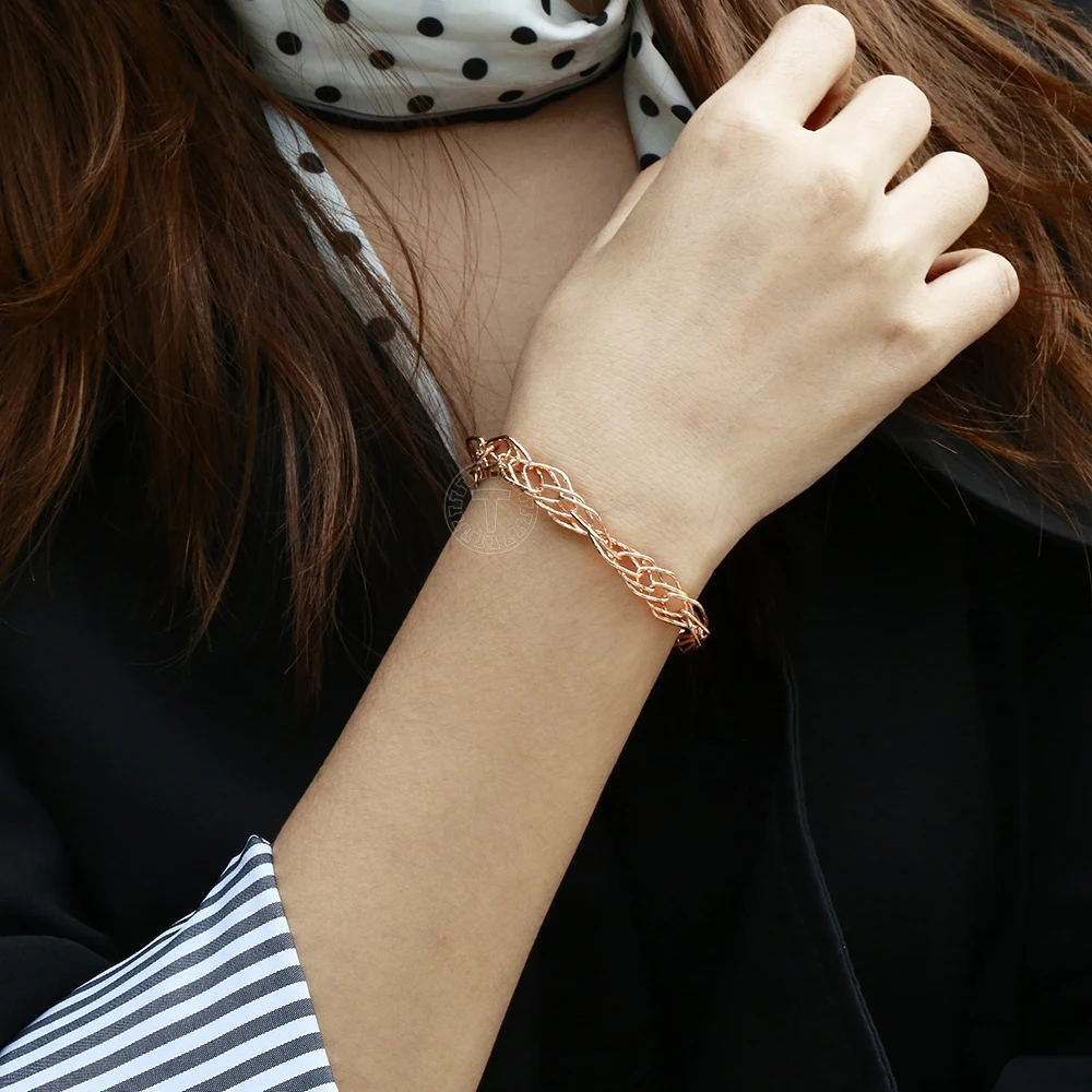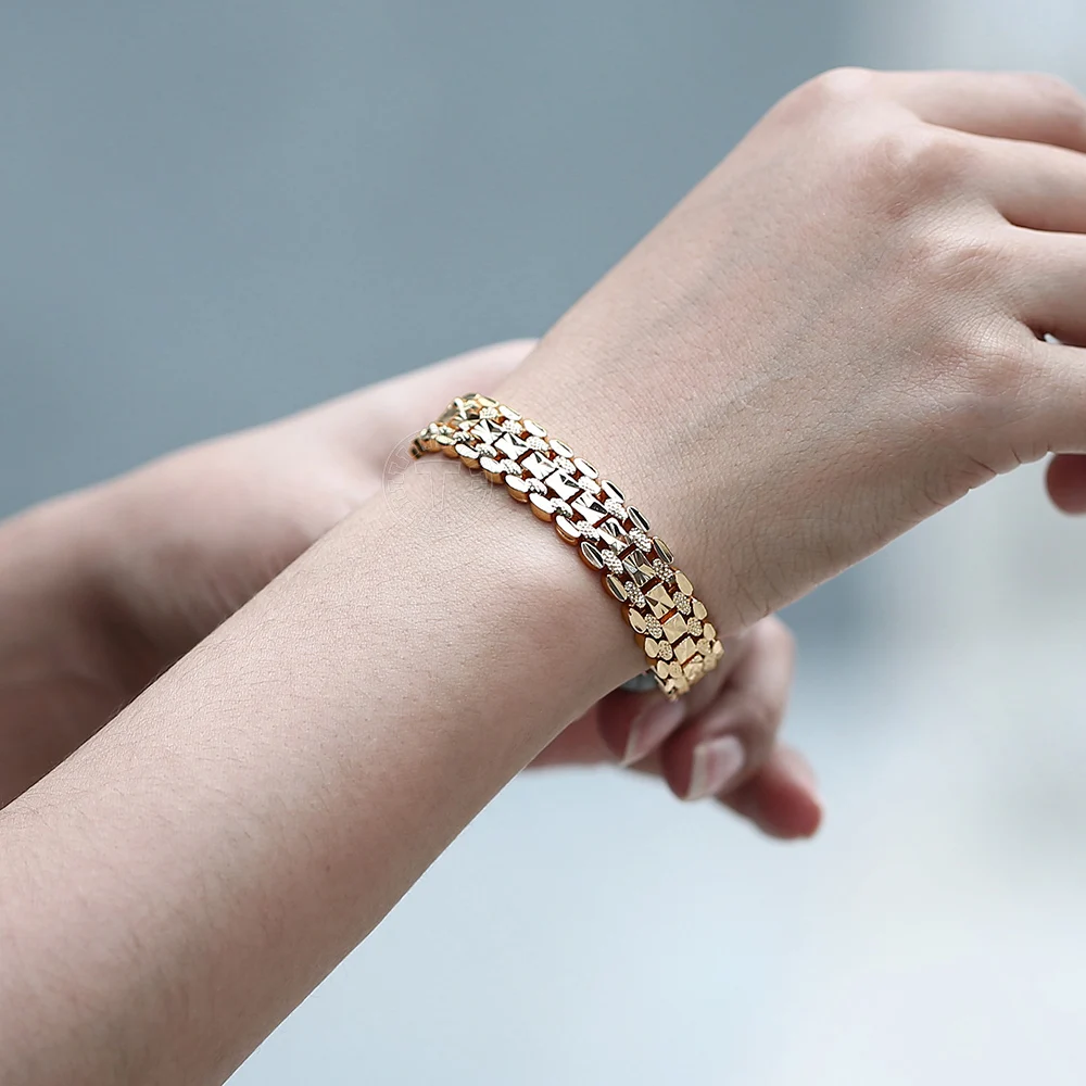 Very beautiful I wear 18 size bracelet, I'm a little big Wat. From gold not to distinguish, I hope for a long time the appearance will remain. But there is a drop of degth: It's very difficult to unzip the bracelet, it's scary to tear, let's see, maybe something will come up, a very hard buckle buckle But very beautiful