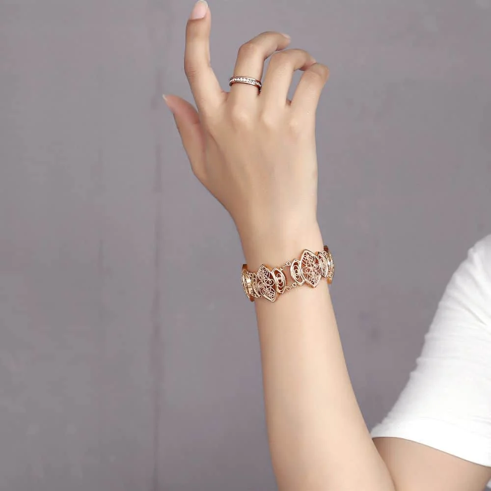 Very beautiful bracelet. It looks like gold, with a beautiful Azhur. Very dovolna. Thank you very much to the store, I recommend to buy.