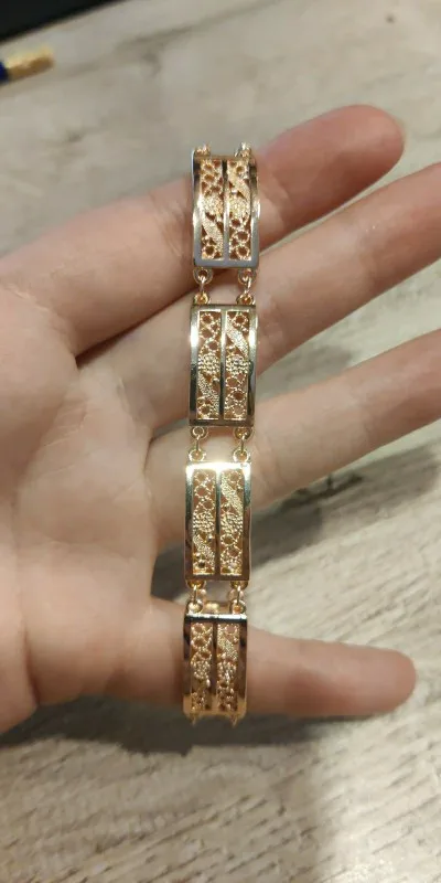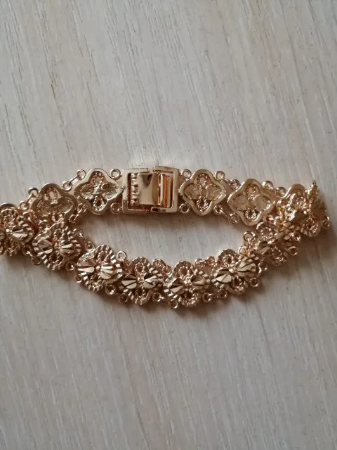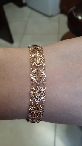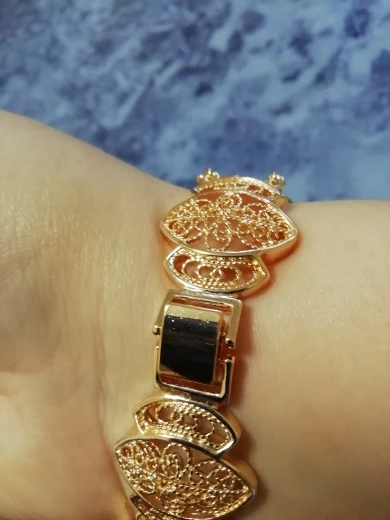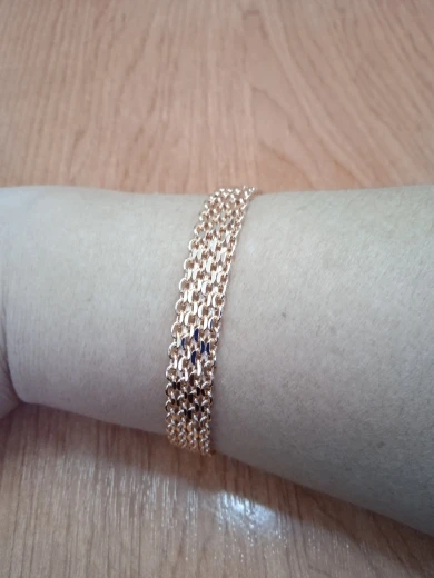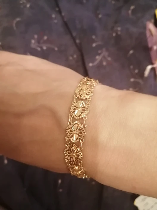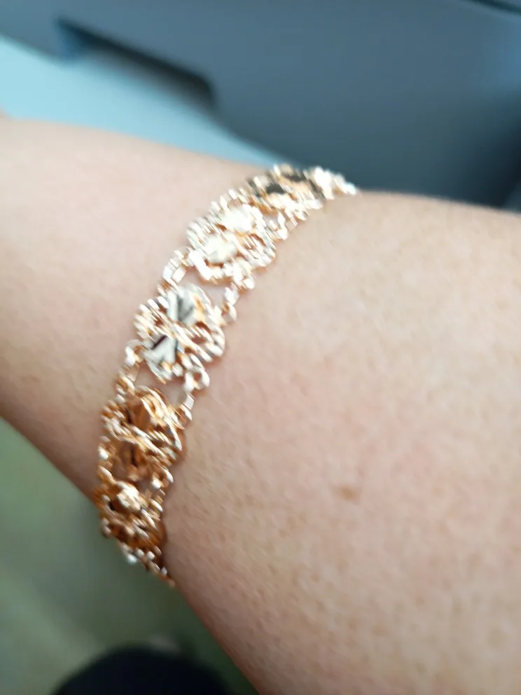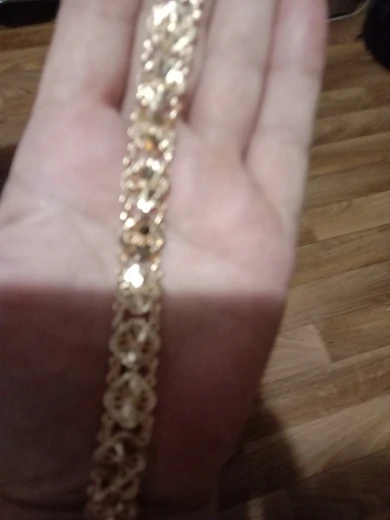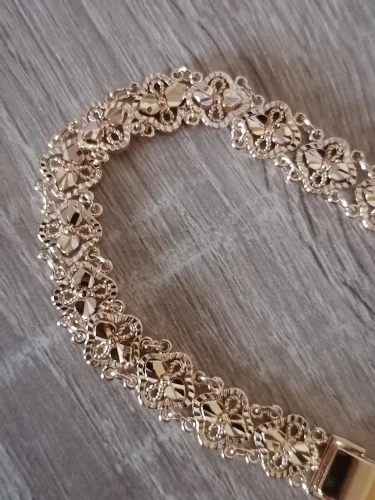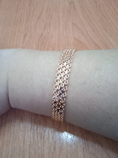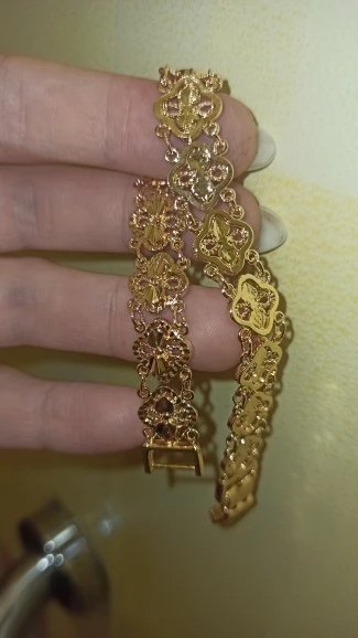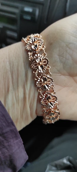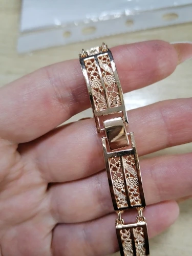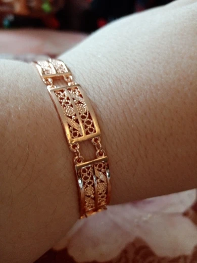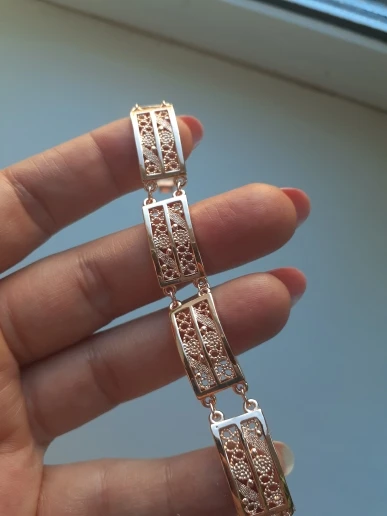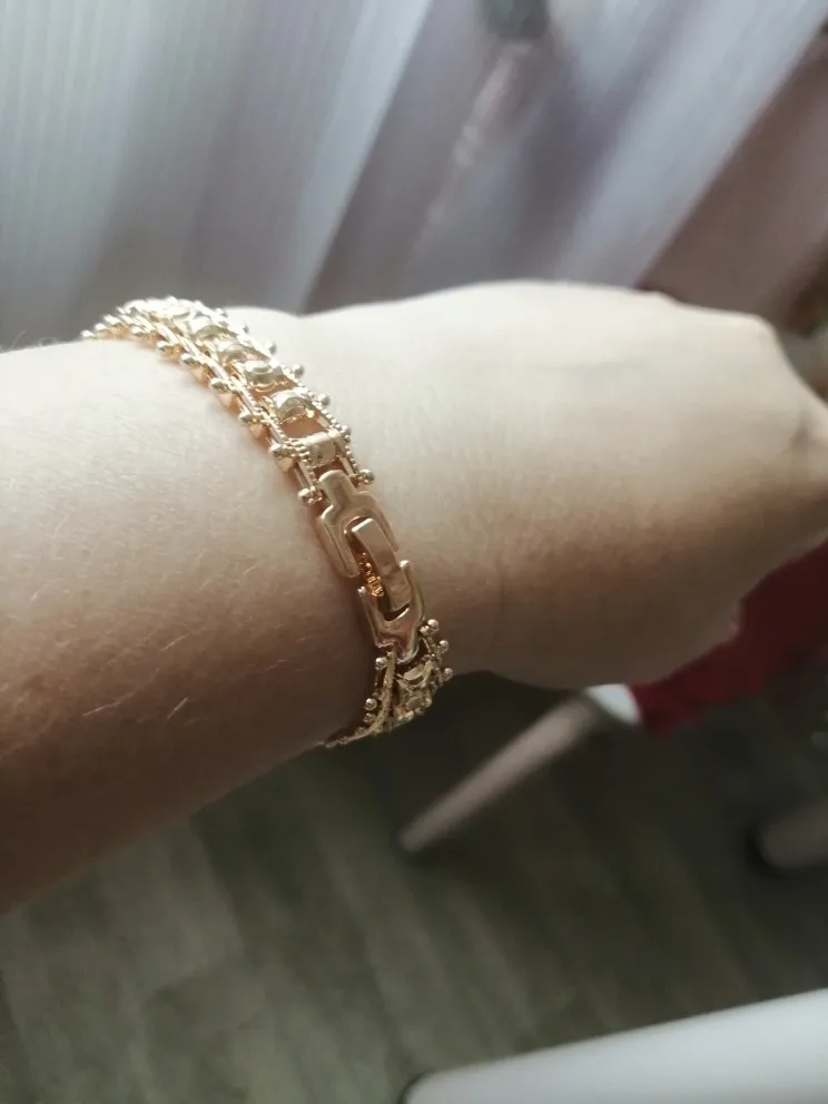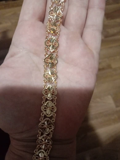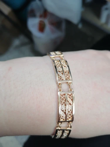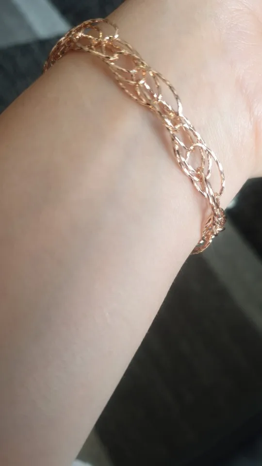 Very beautiful bracelet. It looks like gold, with a beautiful Azhur. Very dovolna. Thank you very much to the store, I recommend to buy.