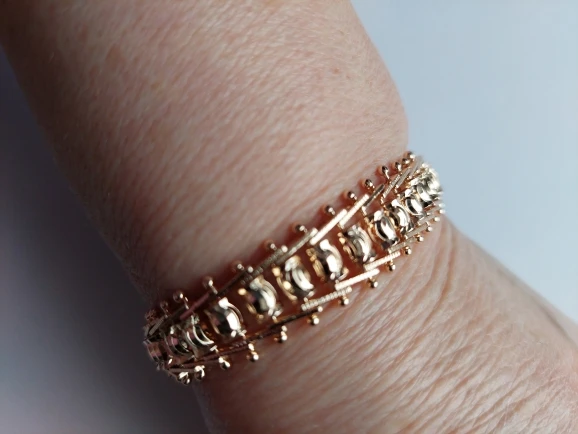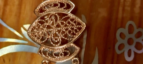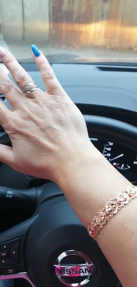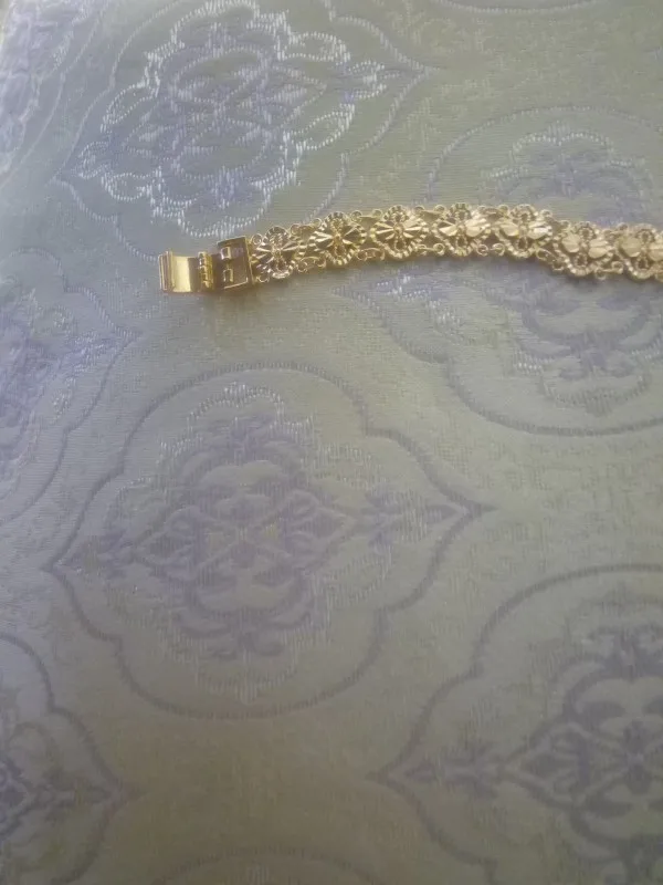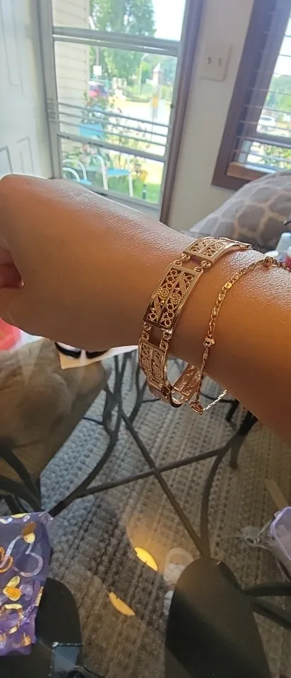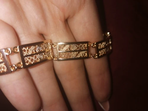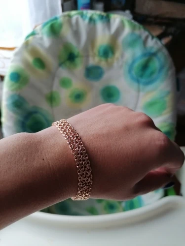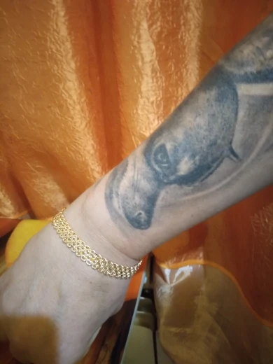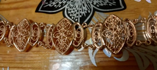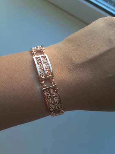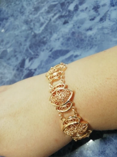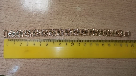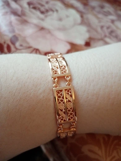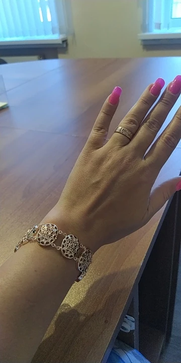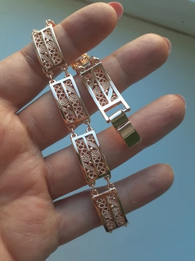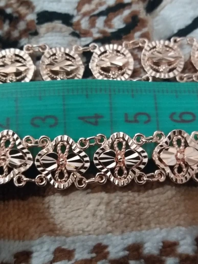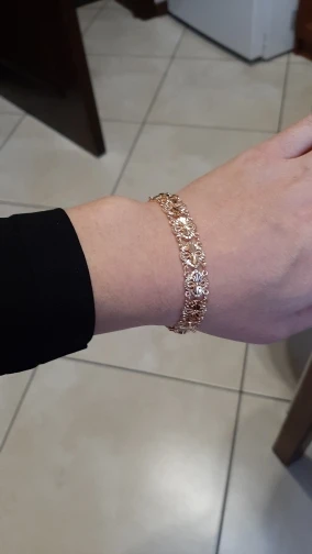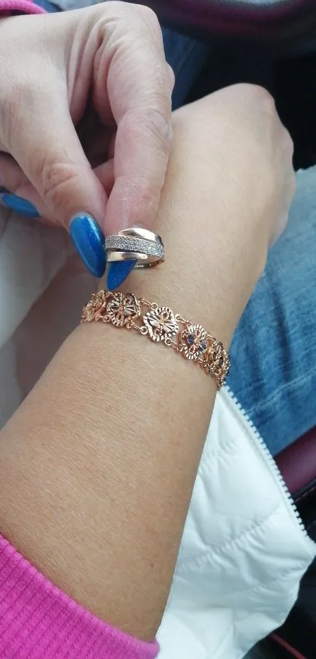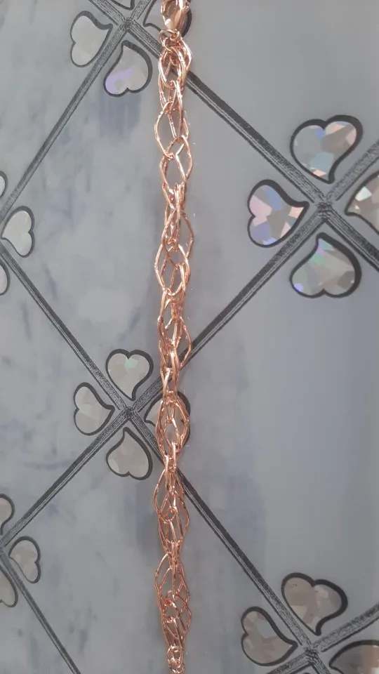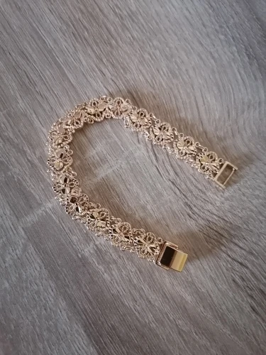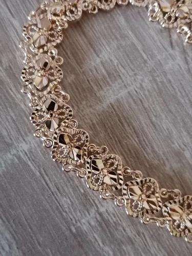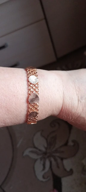 Very beautiful bracelet. It looks like gold, with a beautiful Azhur. Very dovolna. Thank you very much to the store, I recommend to buy.