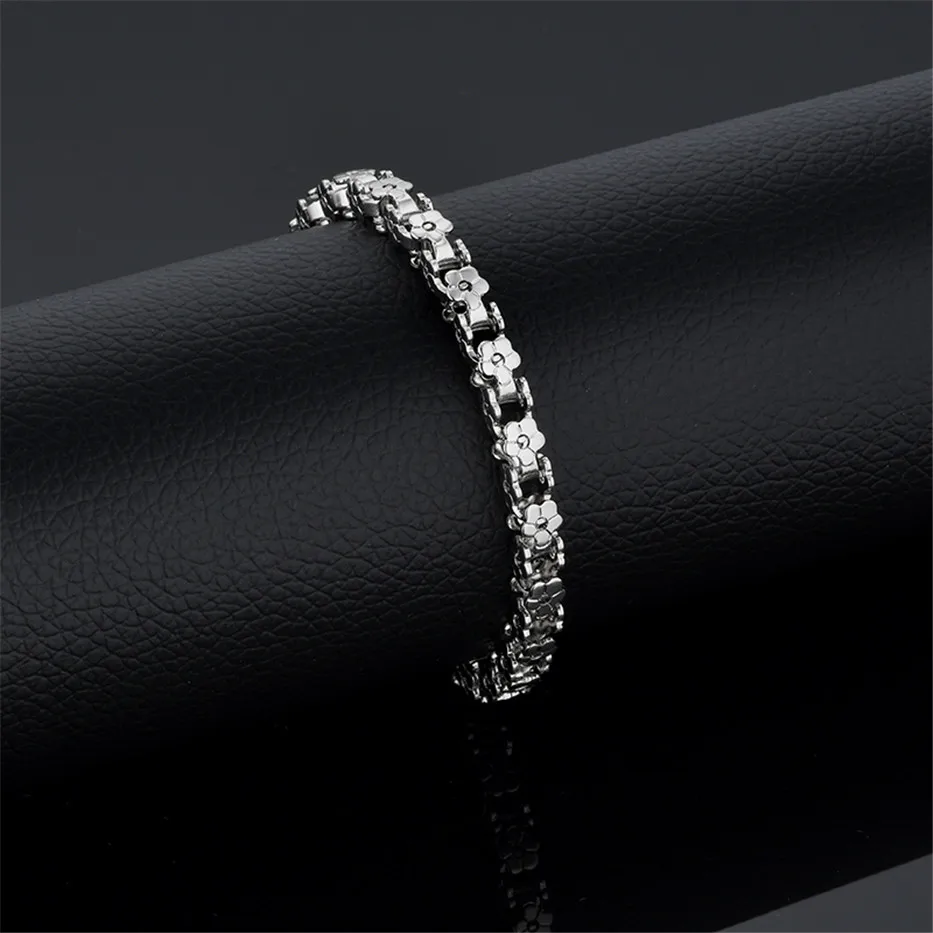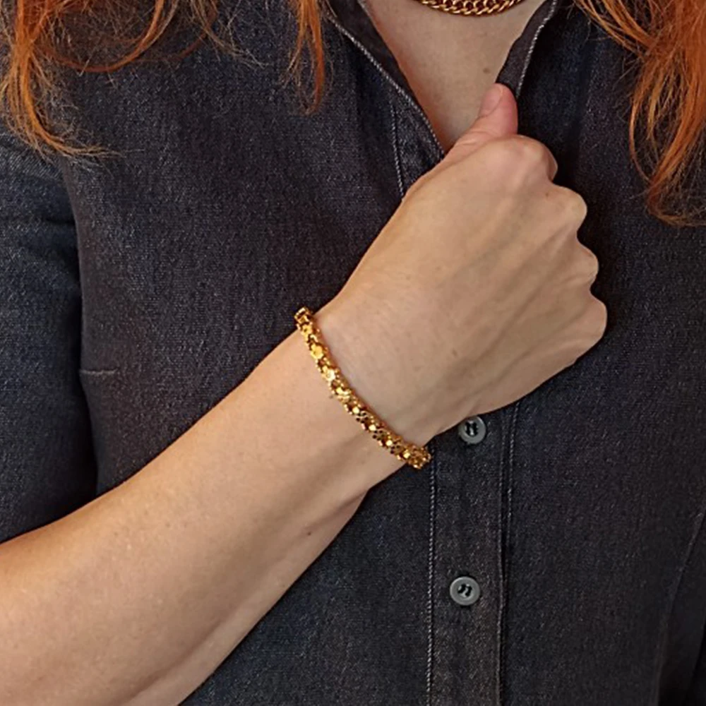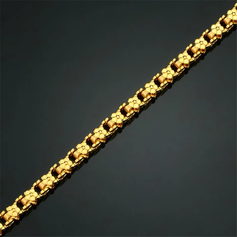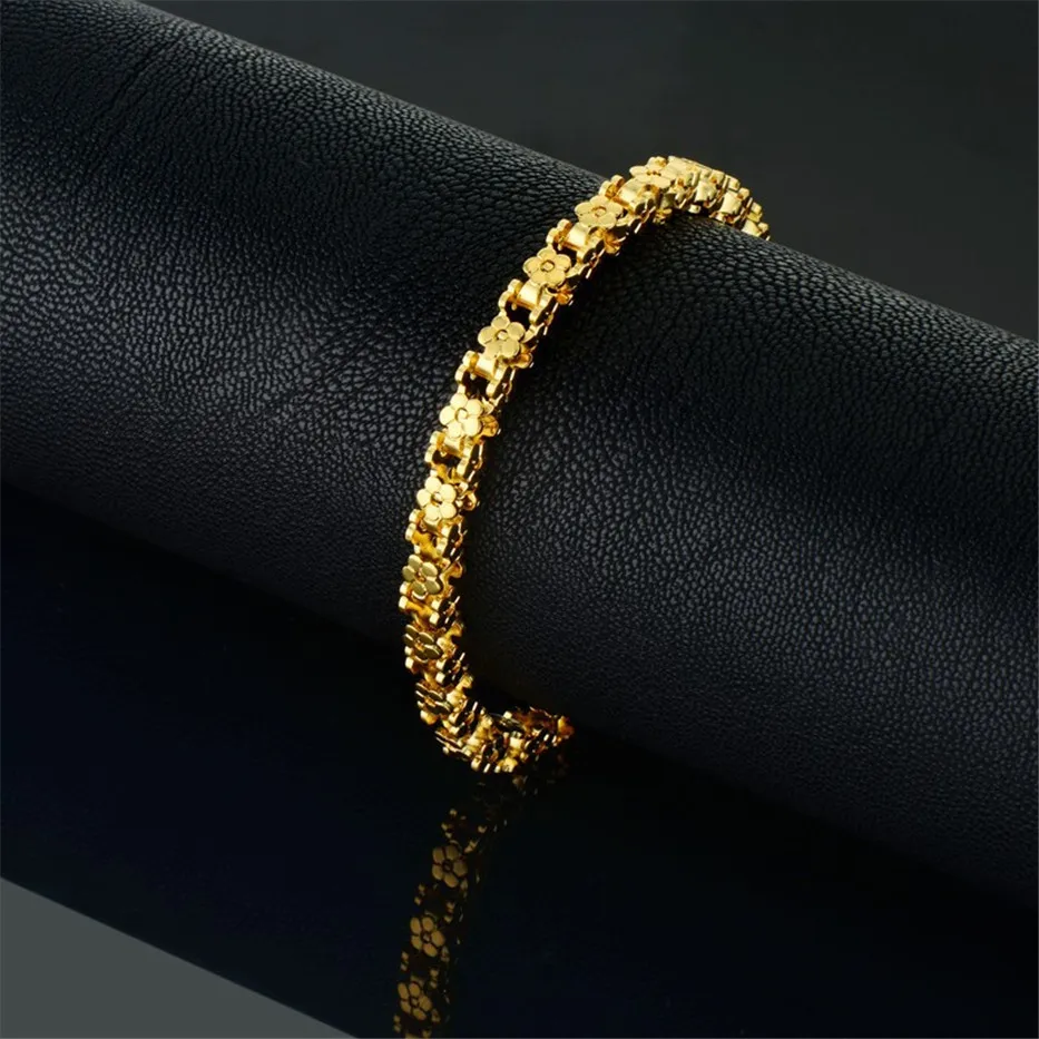 Красивый и стильный браслет. Смотрится чудесно. Цепочка состоит из звеньев оригинальной формы, цвет под золото. Цветочки видны по всем сторонам. Очень нравится. Ношу с большим удовольствием. И главное, металл не потемнеет и полностью антиаллергичный. Упаковка индивидуальная, все надёжно. Доставка тоже порадовала. Рекомендую. Отличный товар и магазин с большим выбором. Буду заказывать ещё.