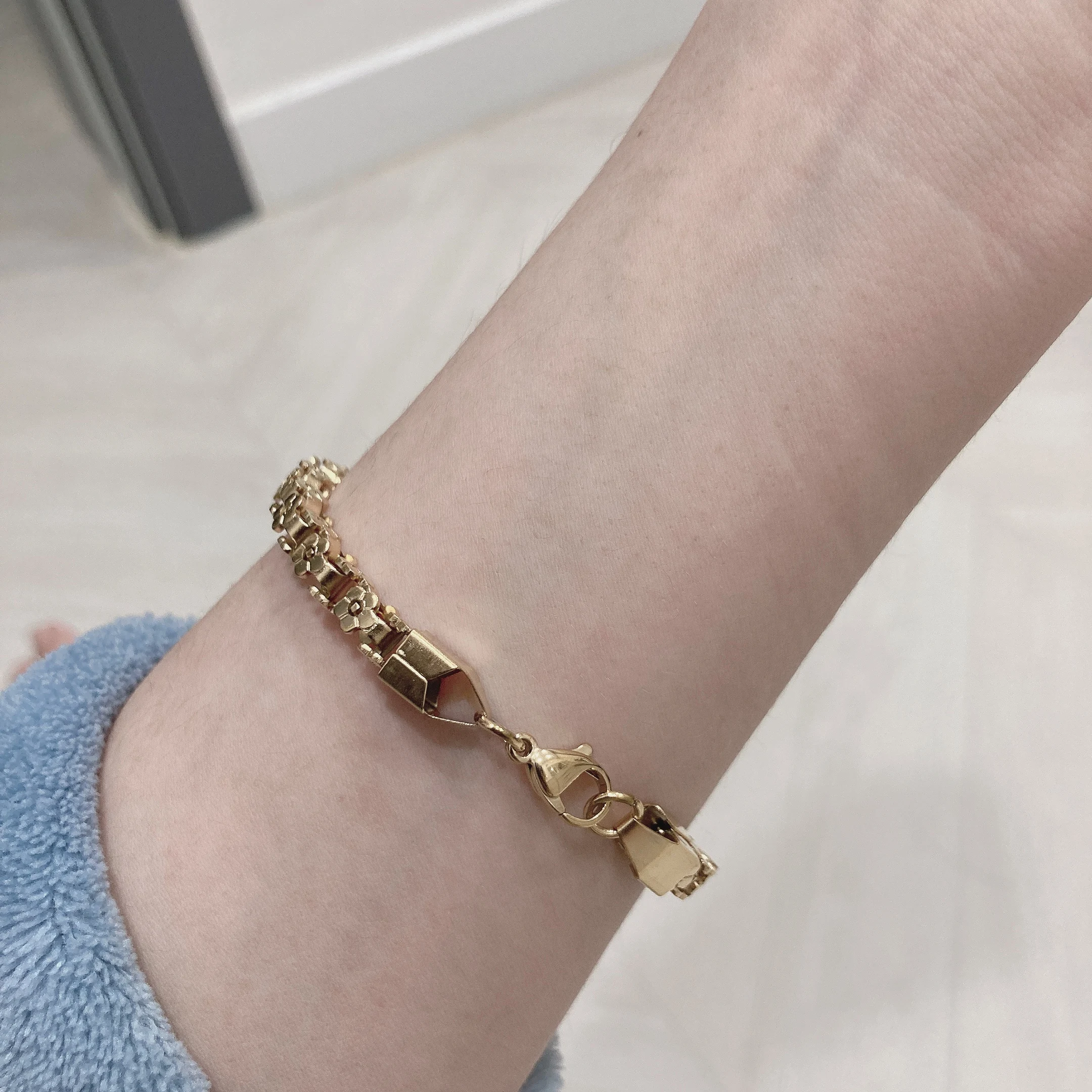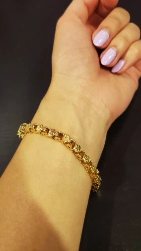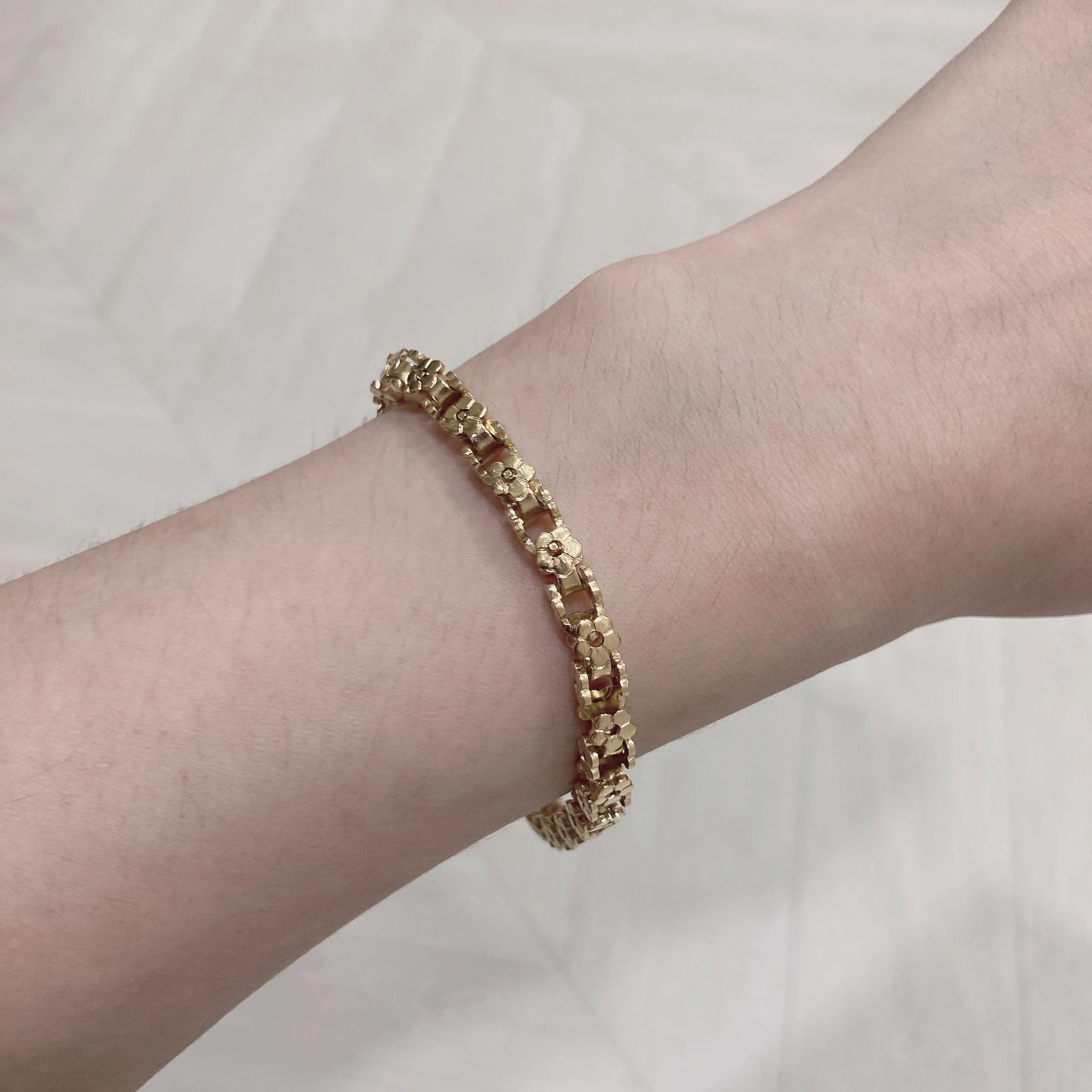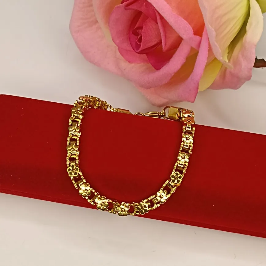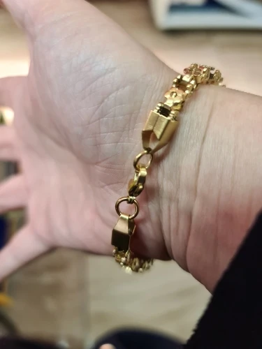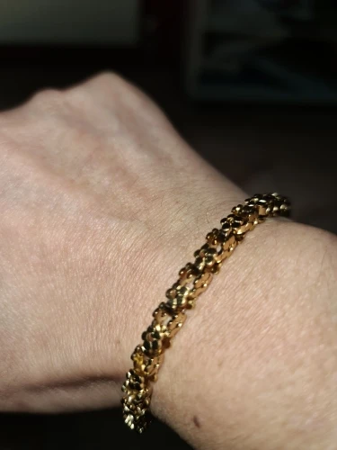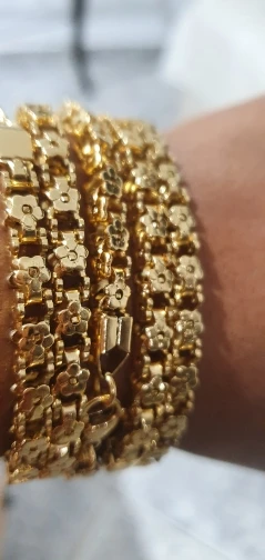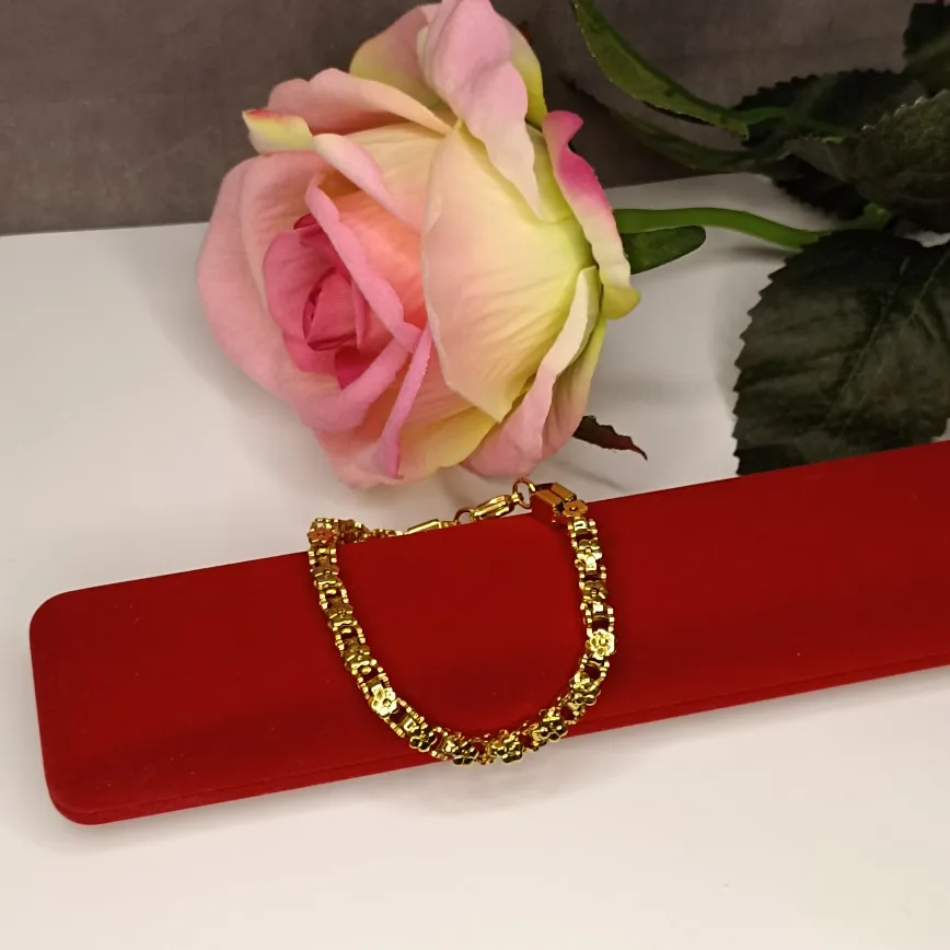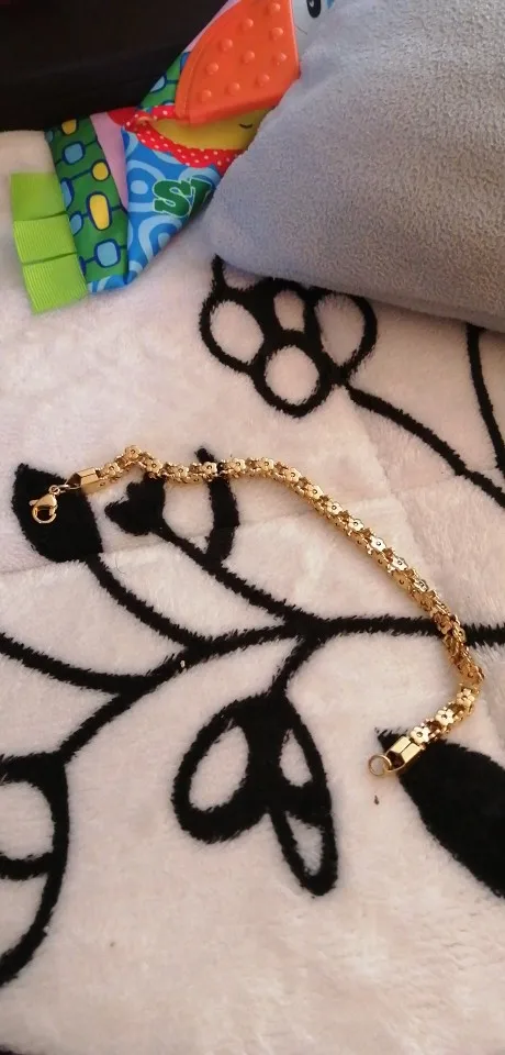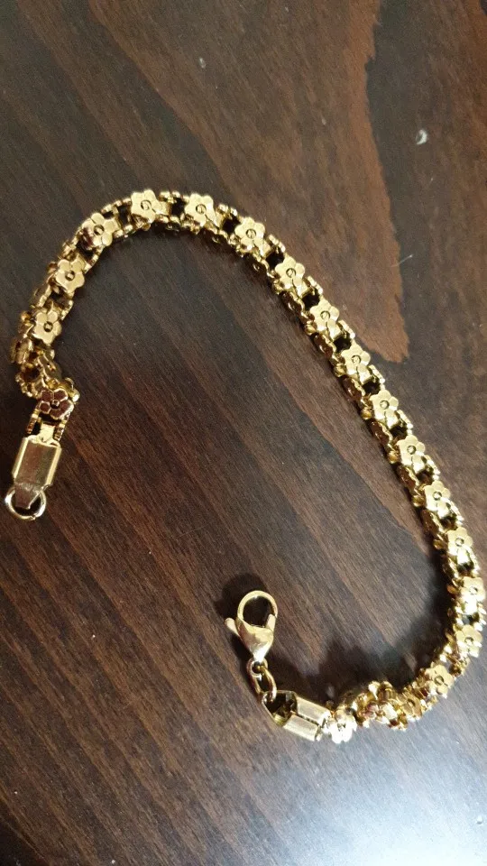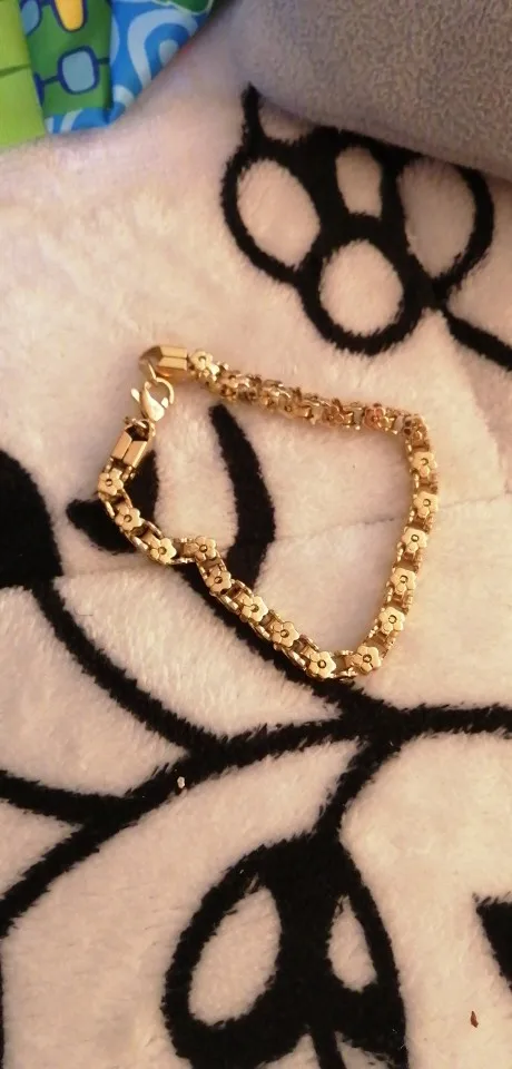 Красивый и стильный браслет. Смотрится чудесно. Цепочка состоит из звеньев оригинальной формы, цвет под золото. Цветочки видны по всем сторонам. Очень нравится. Ношу с большим удовольствием. И главное, металл не потемнеет и полностью антиаллергичный. Упаковка индивидуальная, все надёжно. Доставка тоже порадовала. Рекомендую. Отличный товар и магазин с большим выбором. Буду заказывать ещё.