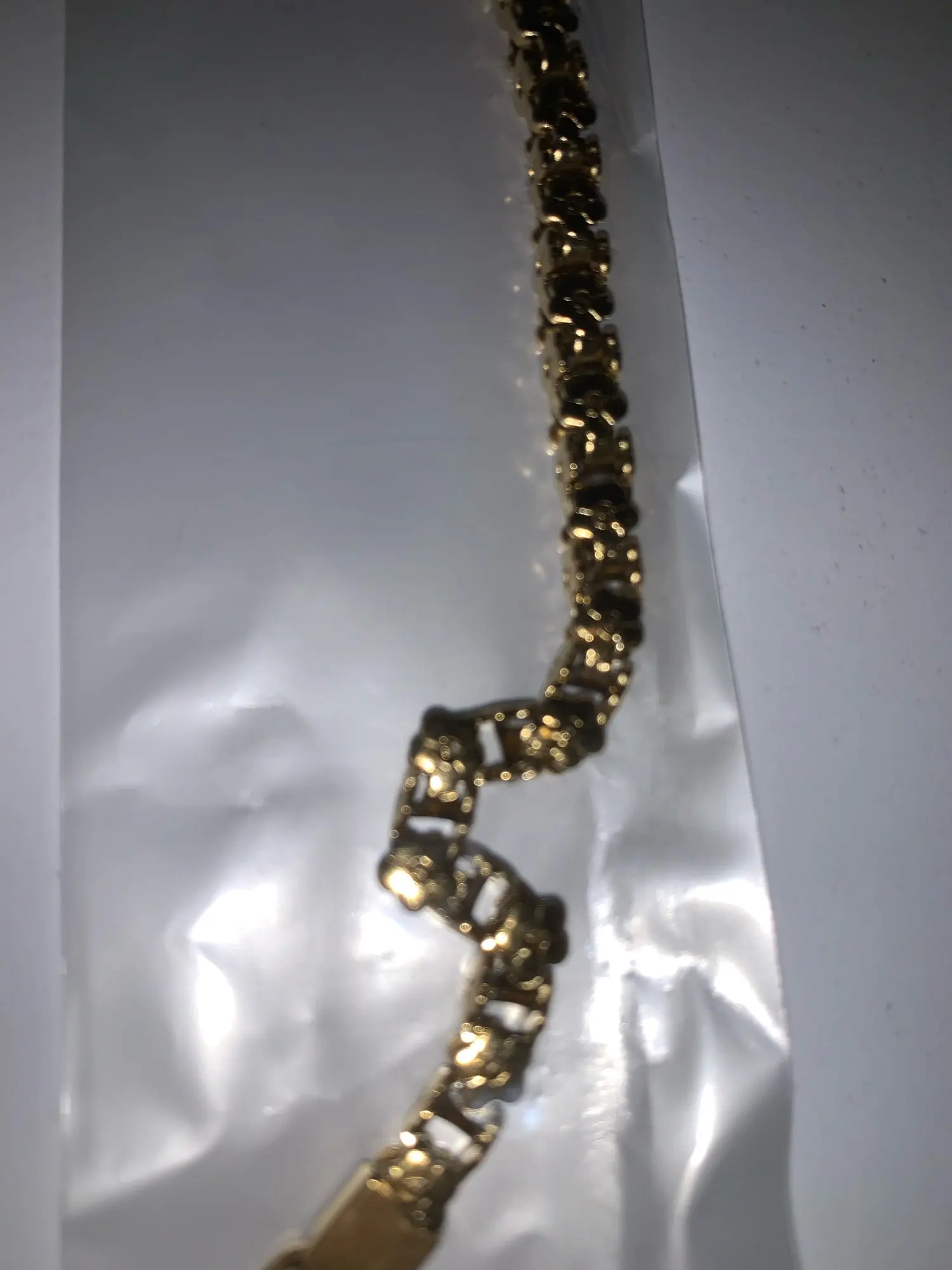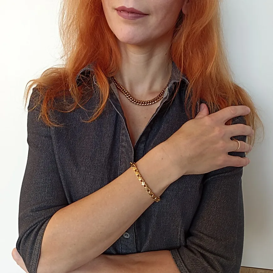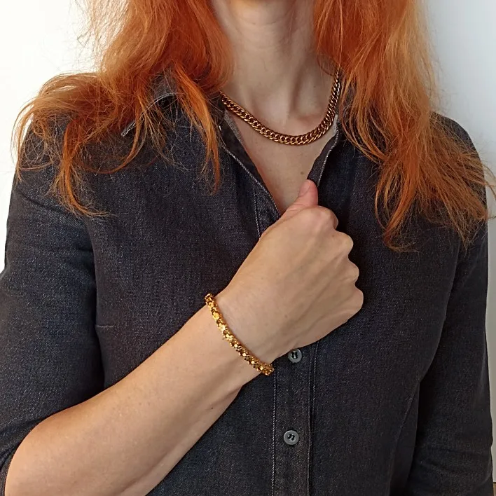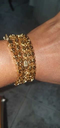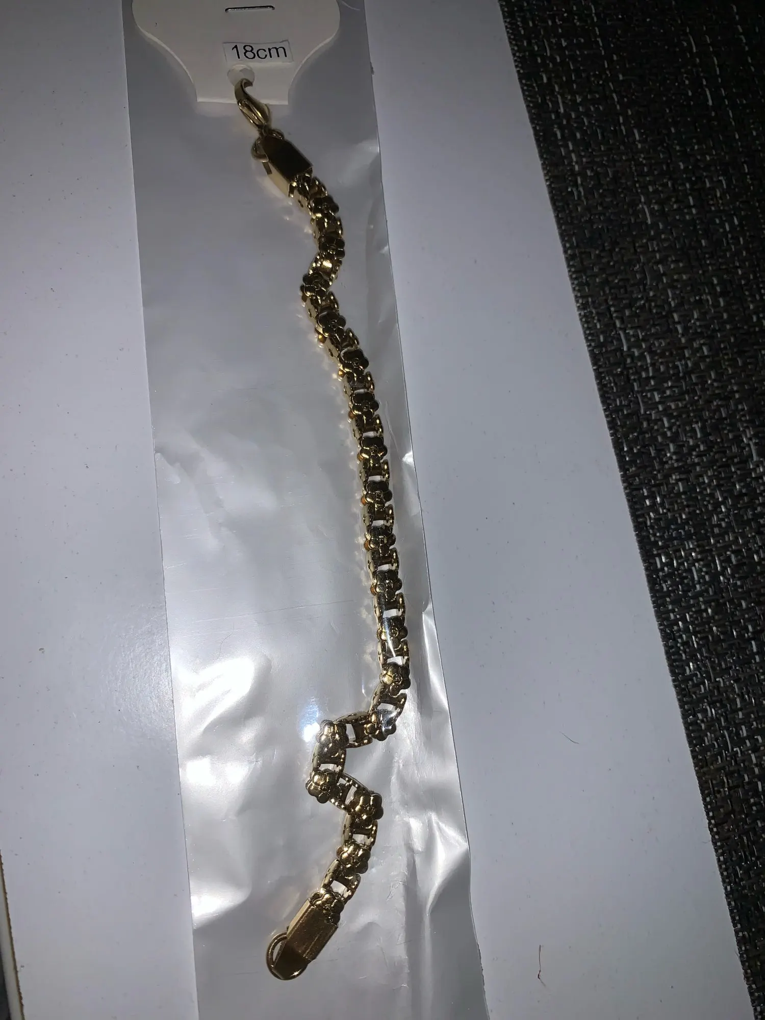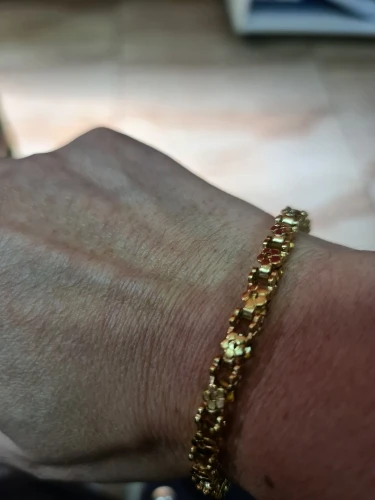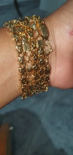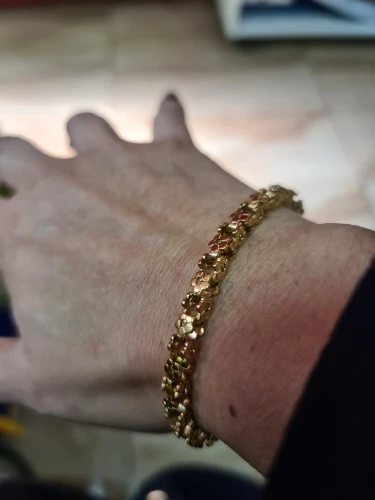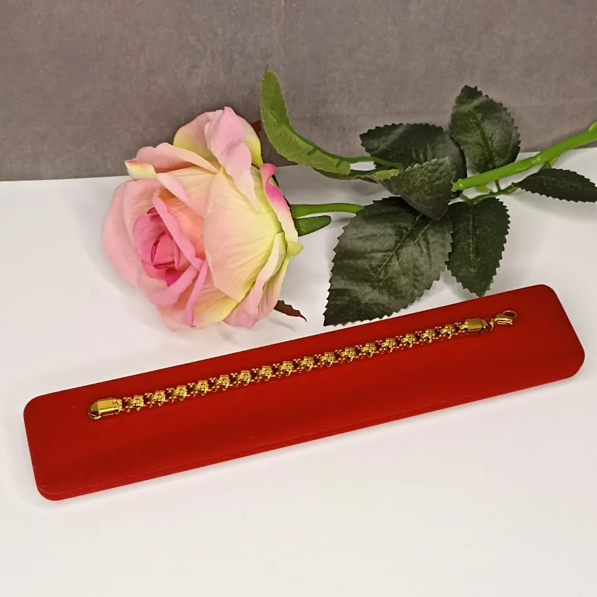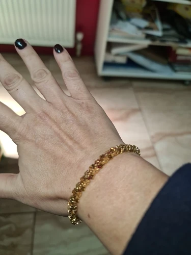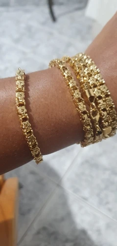 Красивый и стильный браслет. Смотрится чудесно. Цепочка состоит из звеньев оригинальной формы, цвет под золото. Цветочки видны по всем сторонам. Очень нравится. Ношу с большим удовольствием. И главное, металл не потемнеет и полностью антиаллергичный. Упаковка индивидуальная, все надёжно. Доставка тоже порадовала. Рекомендую. Отличный товар и магазин с большим выбором. Буду заказывать ещё.