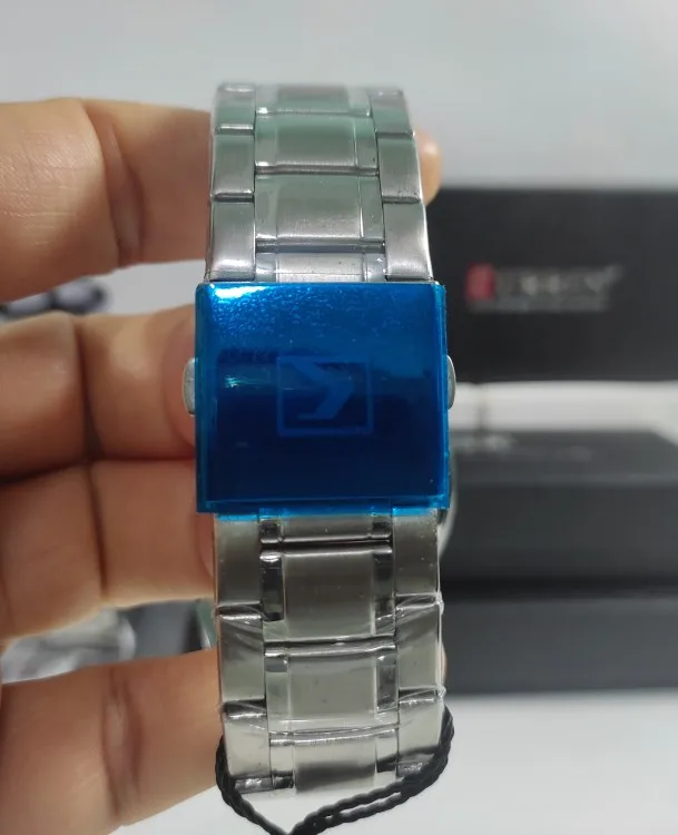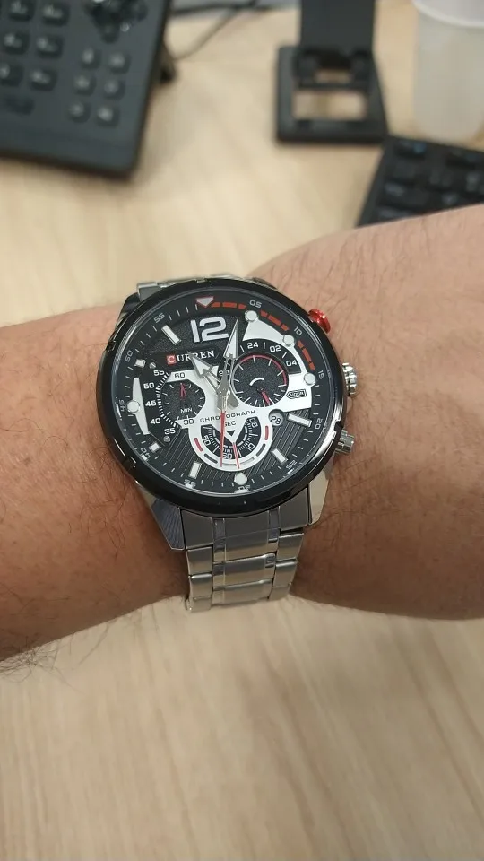 What we have here is a Curren 8395, measuring a colossal 47.3mm diameter (51mm including the crown), 14mm thick (a lot for a quartz watch), 54mm lug-to-lug, screwback 316L stainless steel case, 24mm lug width, with bracelet tapering to 22mm at the clasp. We have three different style pushers, making the appearance consistent in its inconsistency. Making them three different colors continues that trend. Sizing the bracelet was an exercise in patience. That brings me to the one thing I cannot fault: this is a comfortable watch.