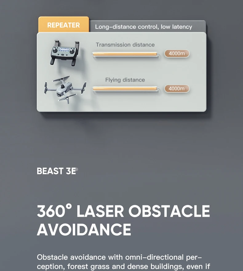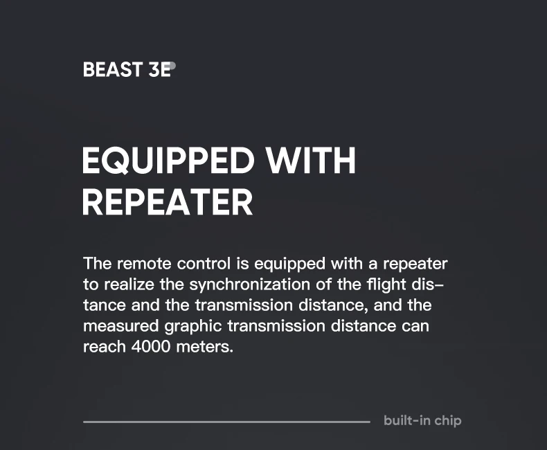 Beast 3 has a variety of return-to-home functions. It automatically records the starting position before take-off. When it is necessary to return to home automatically, it automatically realizes the intelligent return-to-home mode, and it will automatically return to home when the battery is less than about 25% or the remote control loses signal.