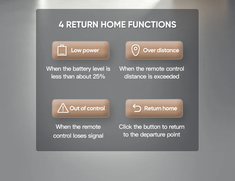 GPS series UAVs have multiple return-to-home functions, and automatically record the starting point position before take-off. When automatic return-to-home is required, the intelligent return-to-home mode is automatically implemented, and when the battery level is lower than about 25%, it will return to home automatically.