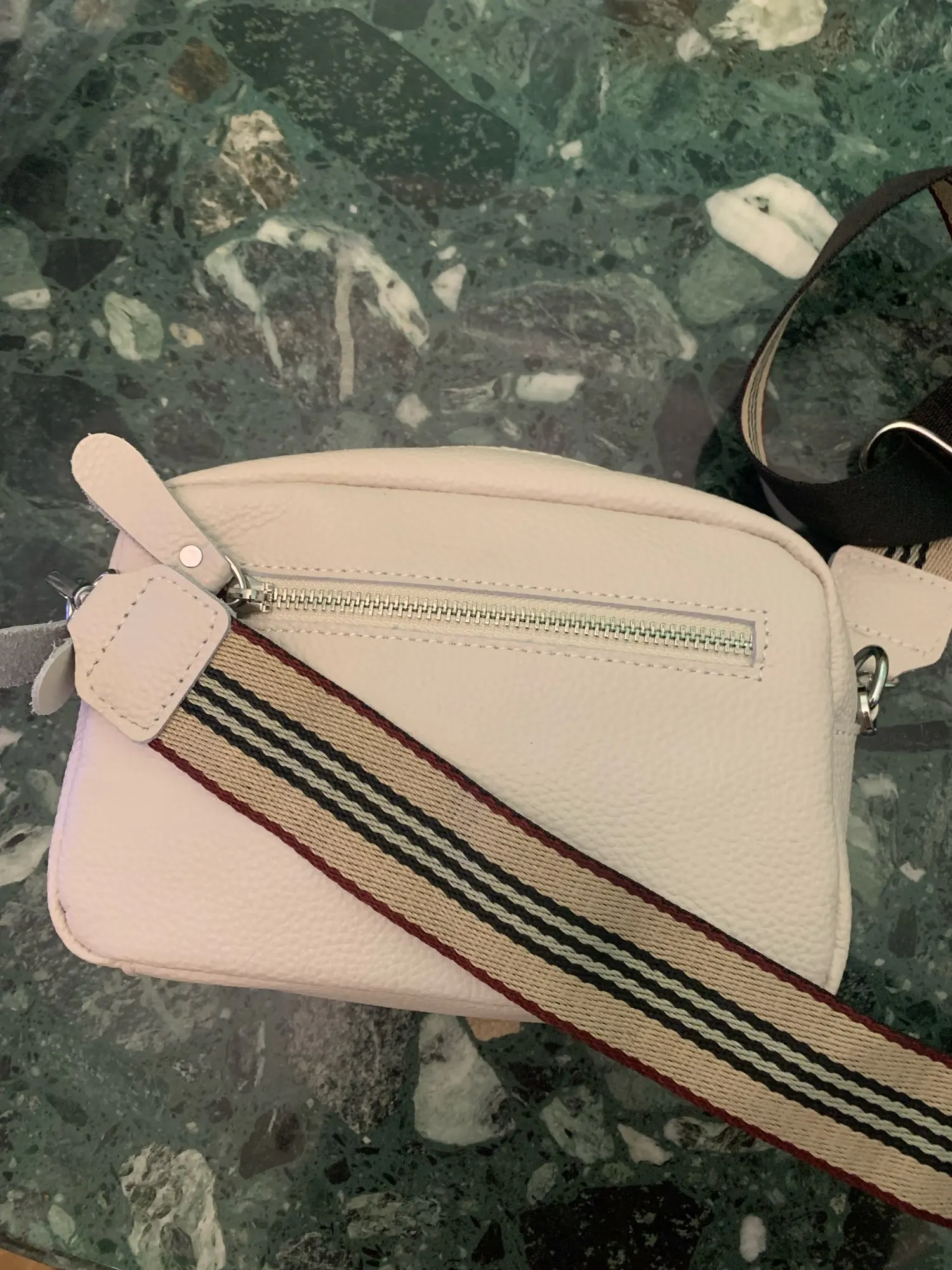 Corresponds to the description. Indeed, the skin, the edges are not hidden, not smeared with paint. Pig apparently the skin, the pattern is large. The color is not drip white, ivory. See the comparison photo with my white bag. I will replace the strap with a more cute one.