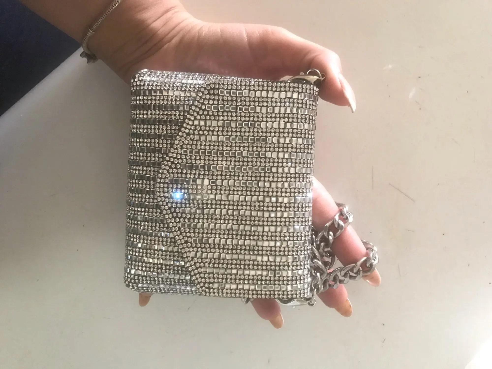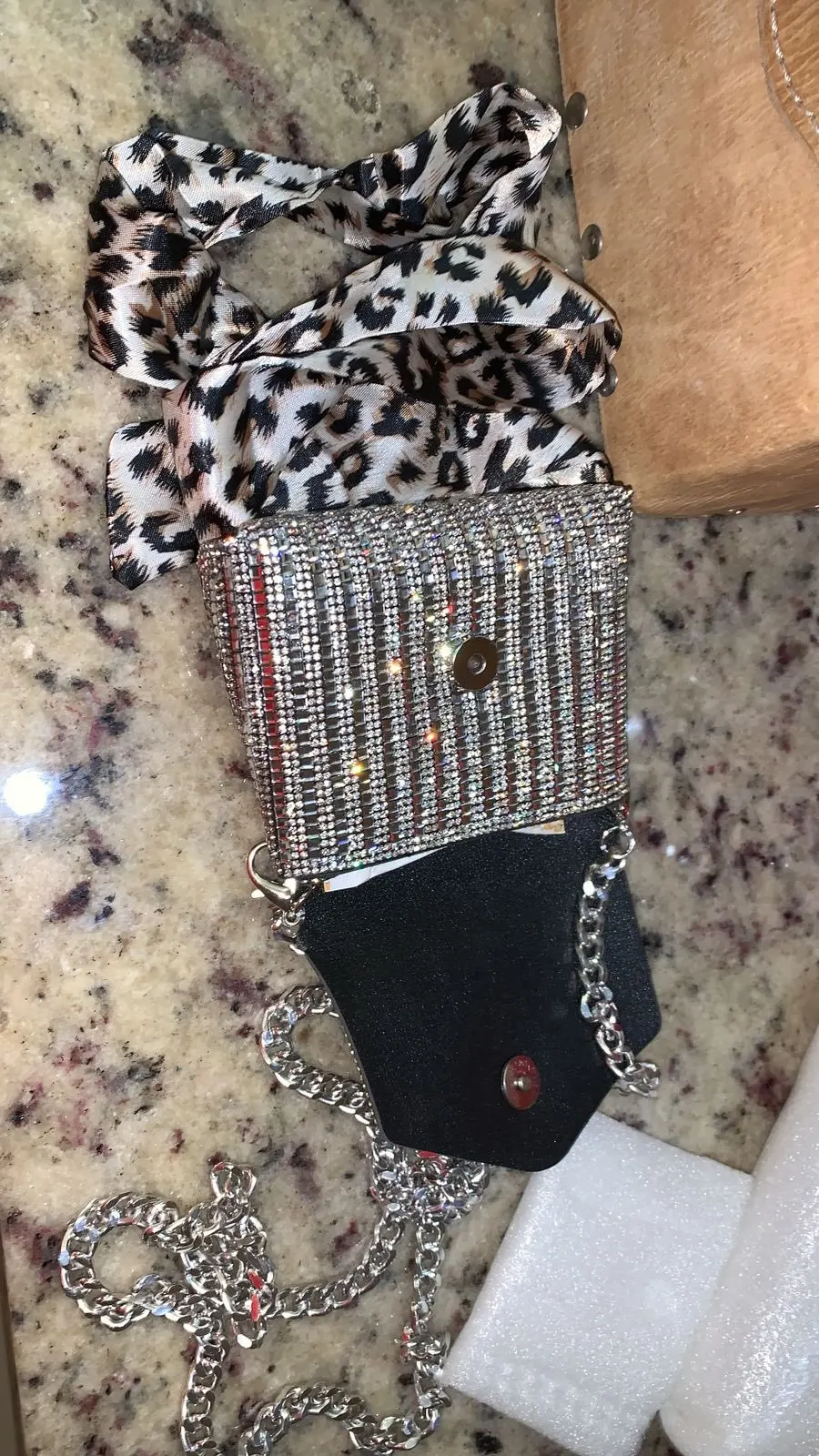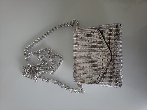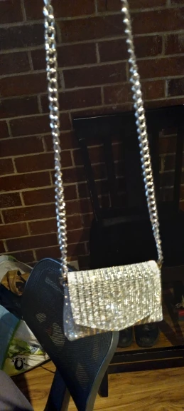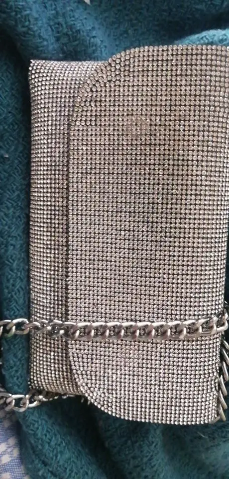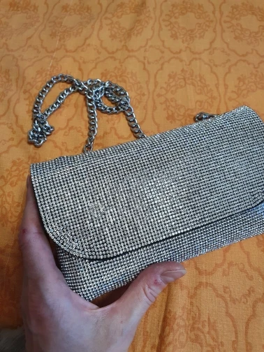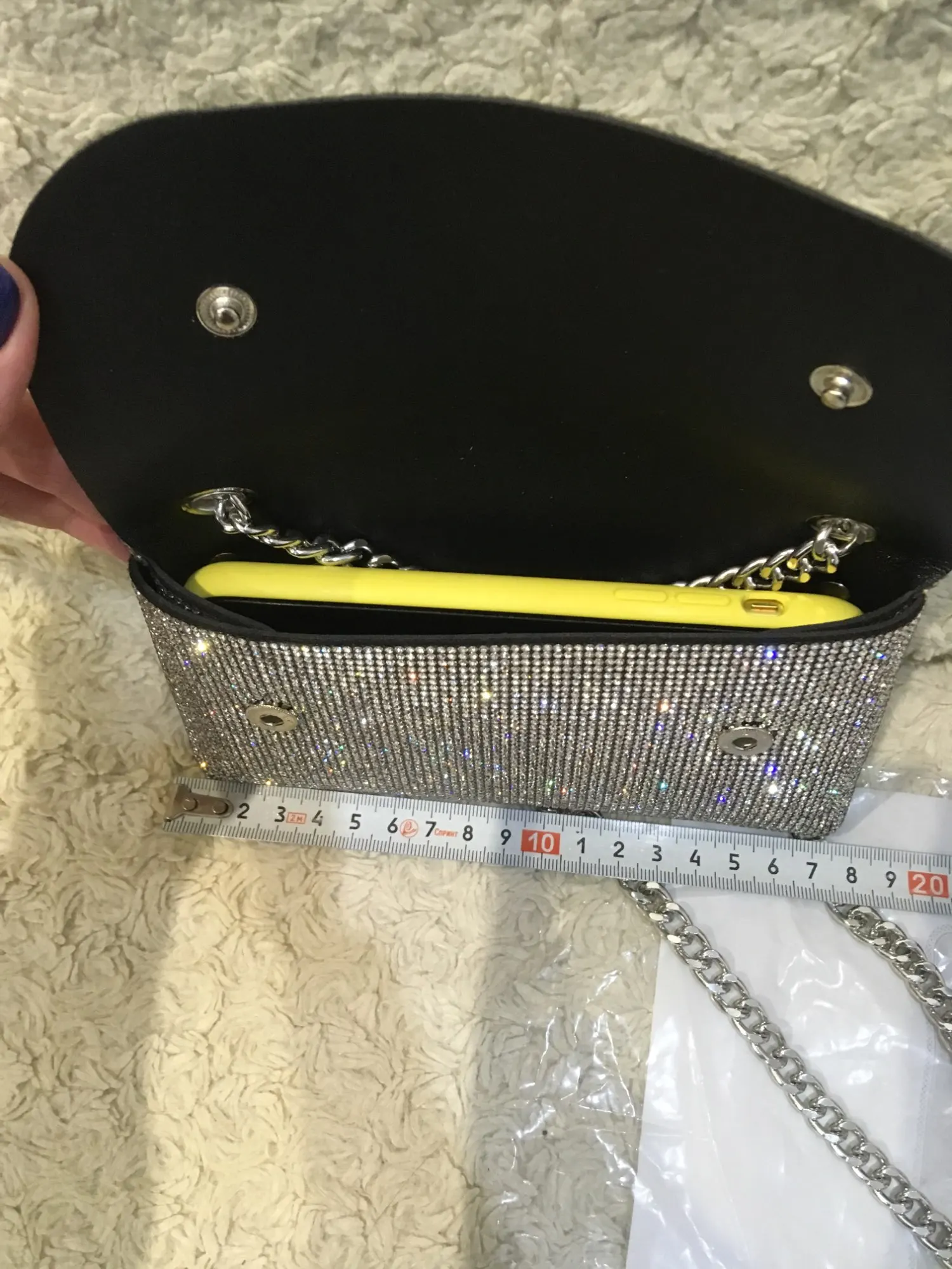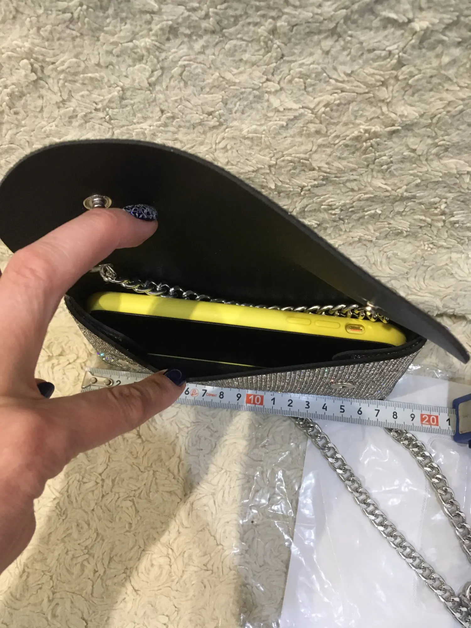 Blind glitter product, looks beautiful. IPhone 11 vlasite butt, in addition, you can put lipstick or keys. Very long shoulder chain. All the rhinestones are in place. The only thing that spoilt the impression is how the bag is made. The fabric is bent on the back side and fastened with rivets, while the black wrong side is visible (see. Photo). If you closely consider the bag, then it is visible its uncomplicated, and "sewing" gives away cheap. However, because of the blinding shine of the front side of the handbag, these shortcomings to the third party search will not be visible. As a gift, a hairband. Thank you