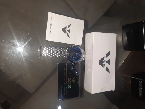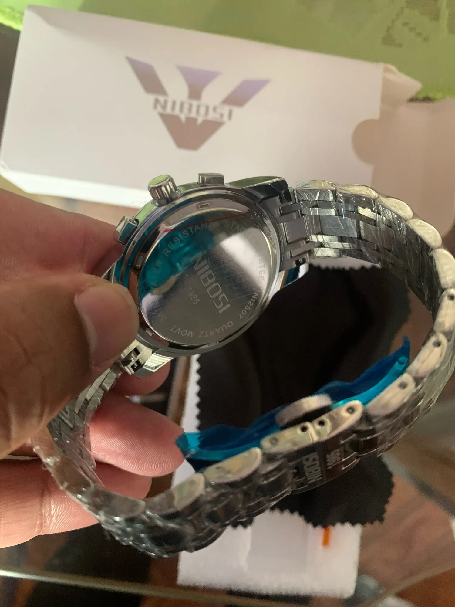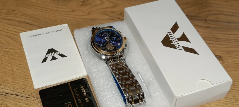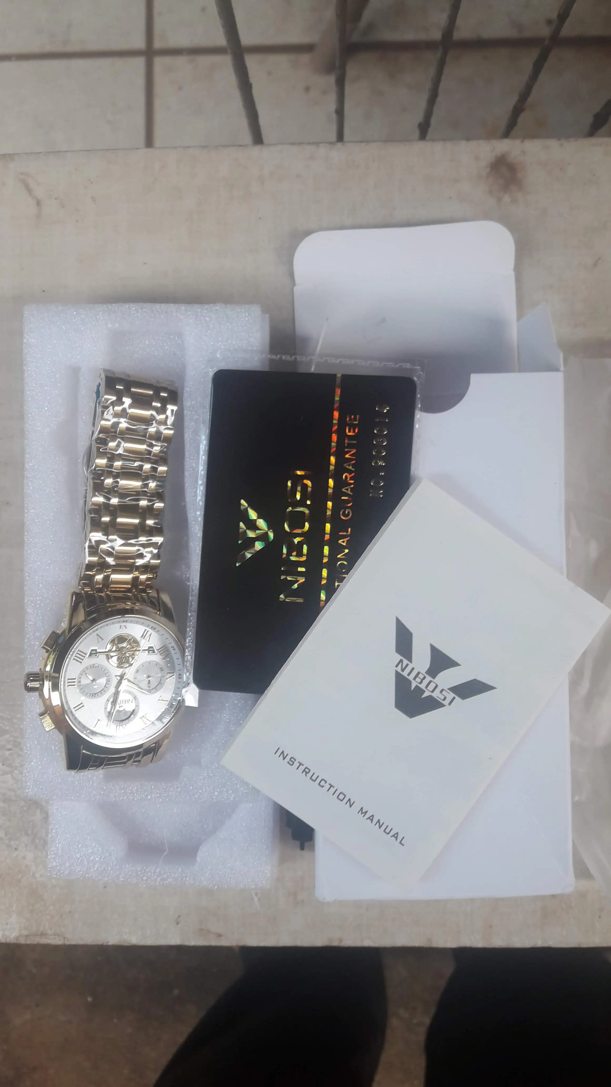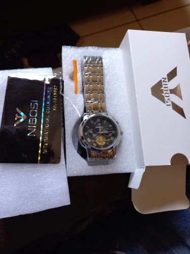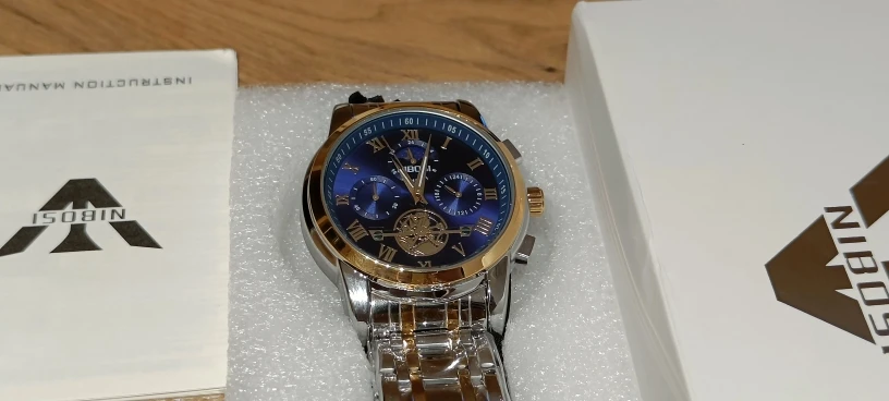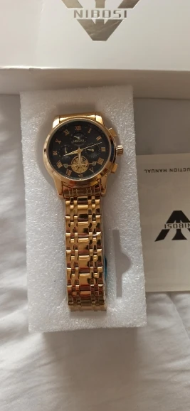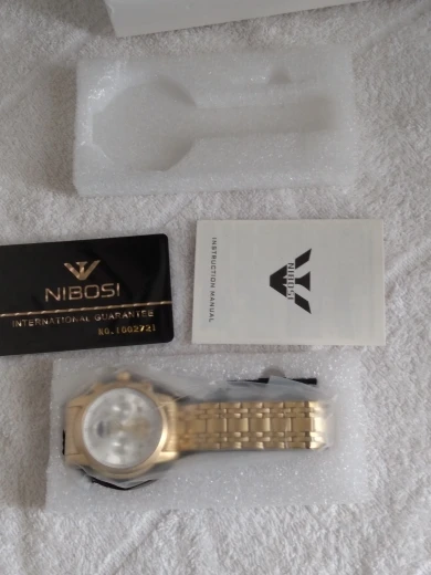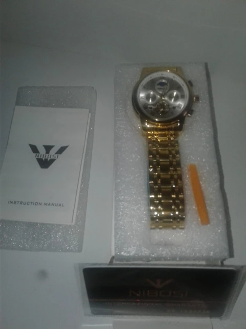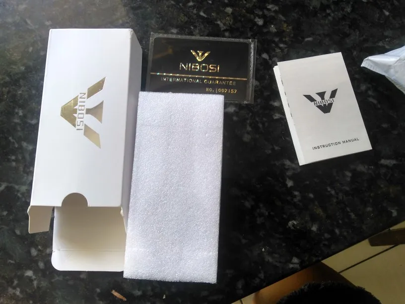 The clock arrived with a dark spots. The took the protective plastic bracelet and was perfect. The spots were in plastic external. Arrived well packed by bubble wrap and in perfect condition. Still not called, but apparently is great. Came in box nibosi White, more simple. Arrived with 18 days, if not mistaken.