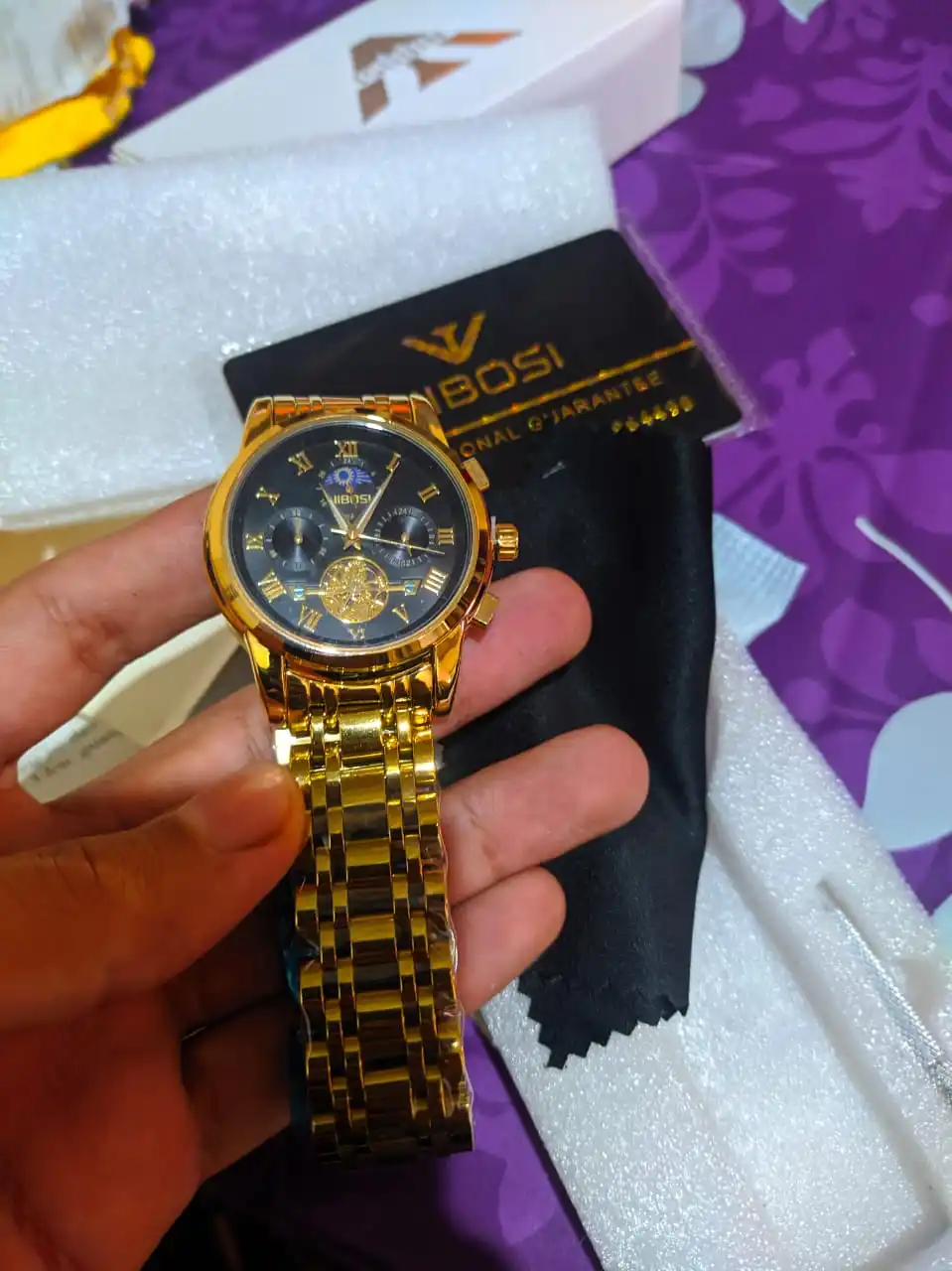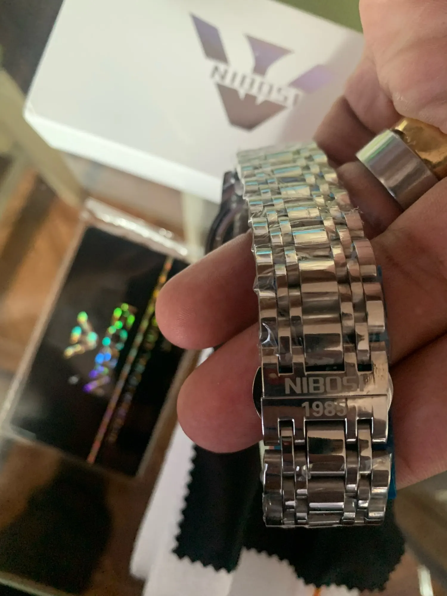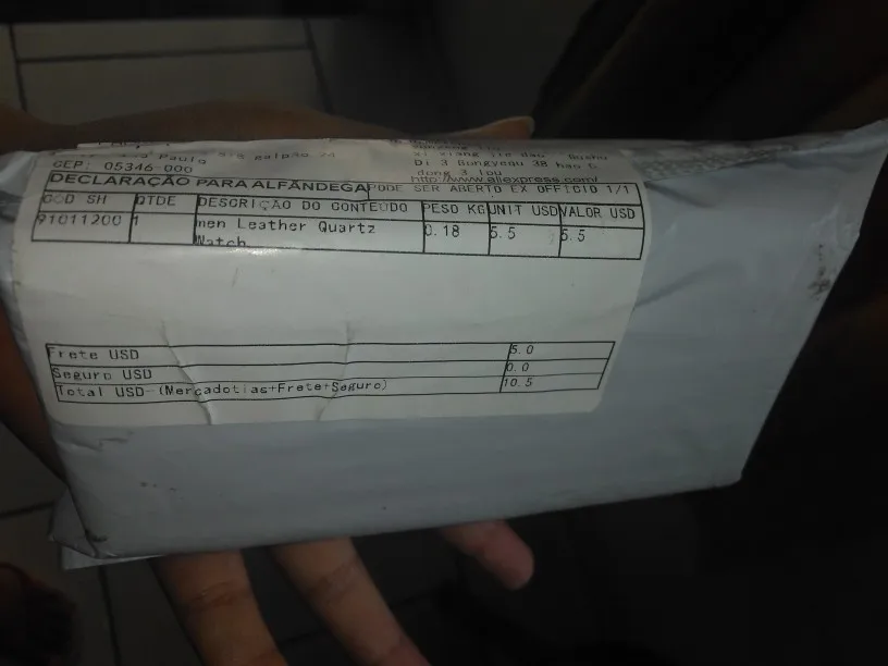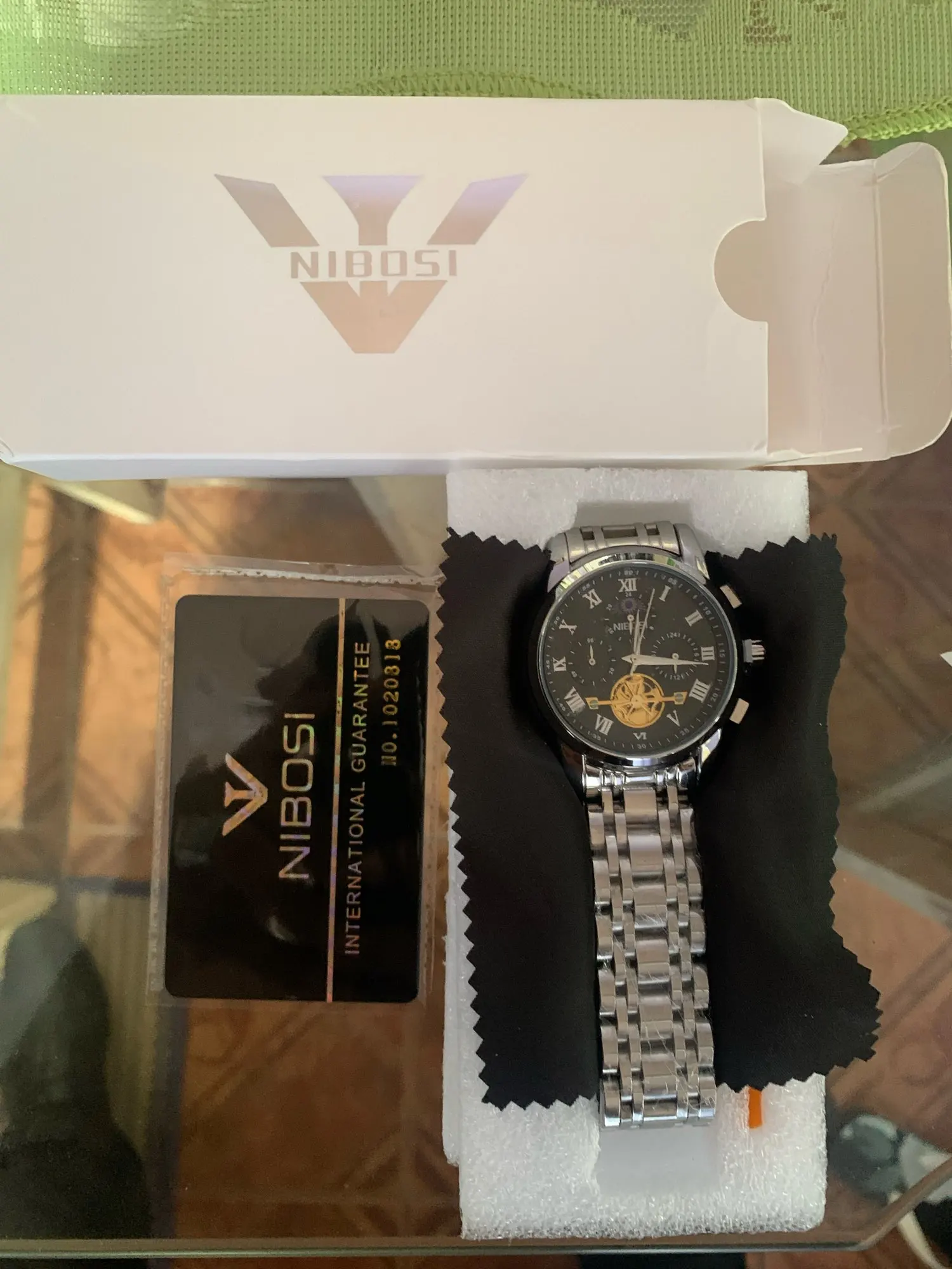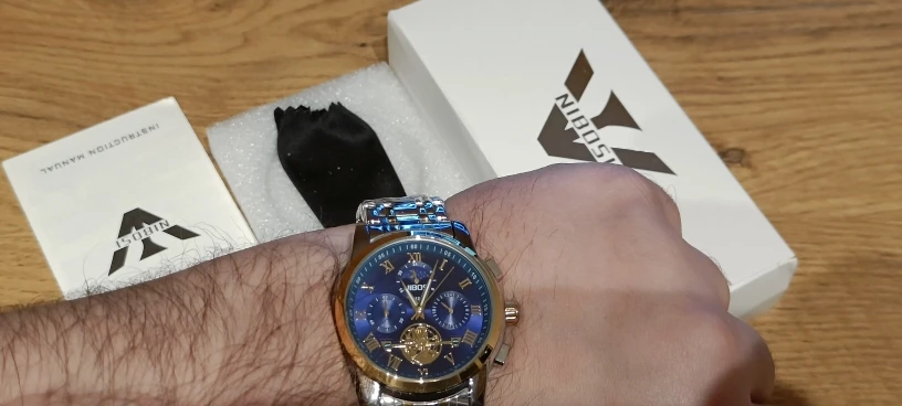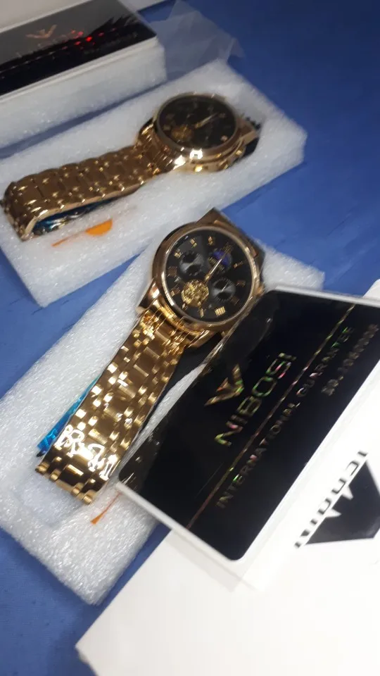 The clock arrived with a dark spots. The took the protective plastic bracelet and was perfect. The spots were in plastic external. Arrived well packed by bubble wrap and in perfect condition. Still not called, but apparently is great. Came in box nibosi White, more simple. Arrived with 18 days, if not mistaken.