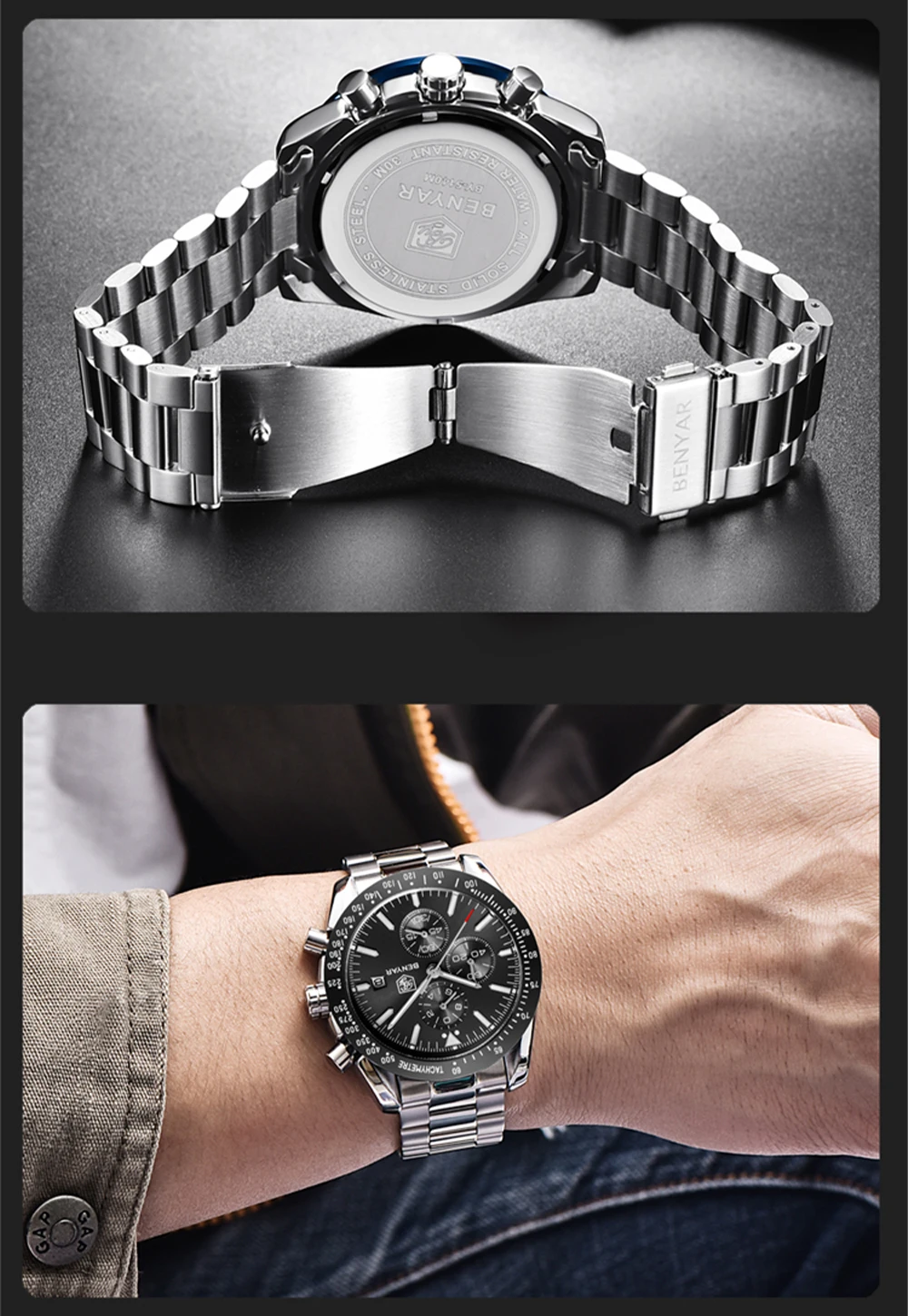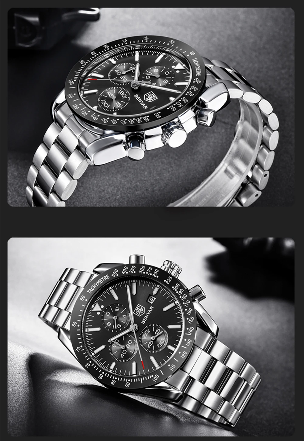 The watch very nice although the case does not the stainless steel as it says, the second hand on the left does not mark well although it does not fail, the timer aligned well. The store sell it with stainless steel, stainless steel the strap with good closure, the box not the stainless steel the alloy. It should make some with a box of 44 or 45mm. In steel with ceramic bezel and sapphire crystal even if it is more expensive how it makes Pagani. If you read this is a seller who takes note. I prefer to spend a little more €, but make it stainless steel, sapphire crystal and ceramic bezel. Greetings