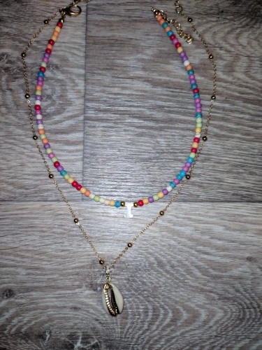 Очень расстроилась когда увидела что цепочка не цельная, а кусочек скрутили проволокой. Проверяйте сразу, так как я сперва не заметила вообще. Будет царапать шею, зацеплять волосы, да и вообще не надёжно. В целом своих денег стоит, колье очень понравилось, кроме этого недостатка.