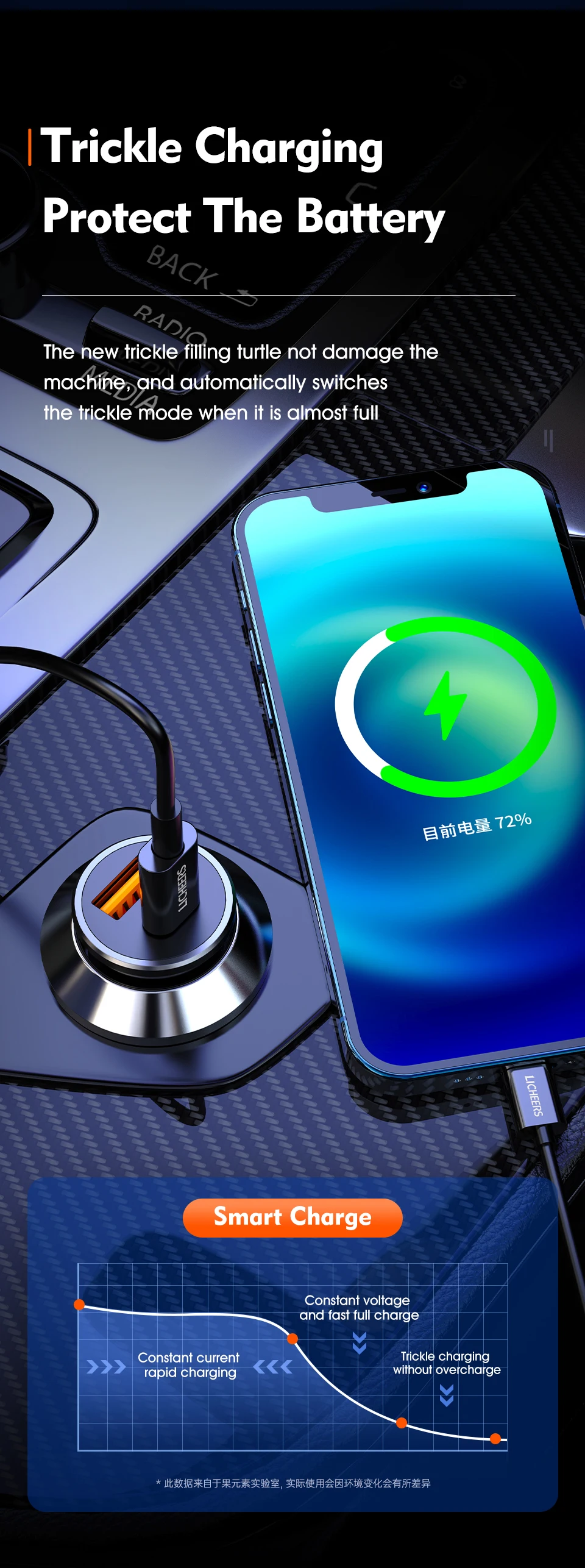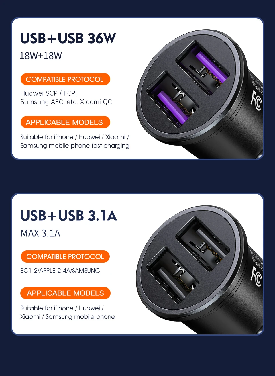 Ordered 2 charges, at 3.1A (dim font) and at 36 W (bright font and lilac USB port), fast charging only the cheapest adapter shows normal charging, for their money they are worth it, externally consist of metal, pleasant to the touch, And fit into the cigarette lighter clearly on the edge, delivery of debt, just over a month.