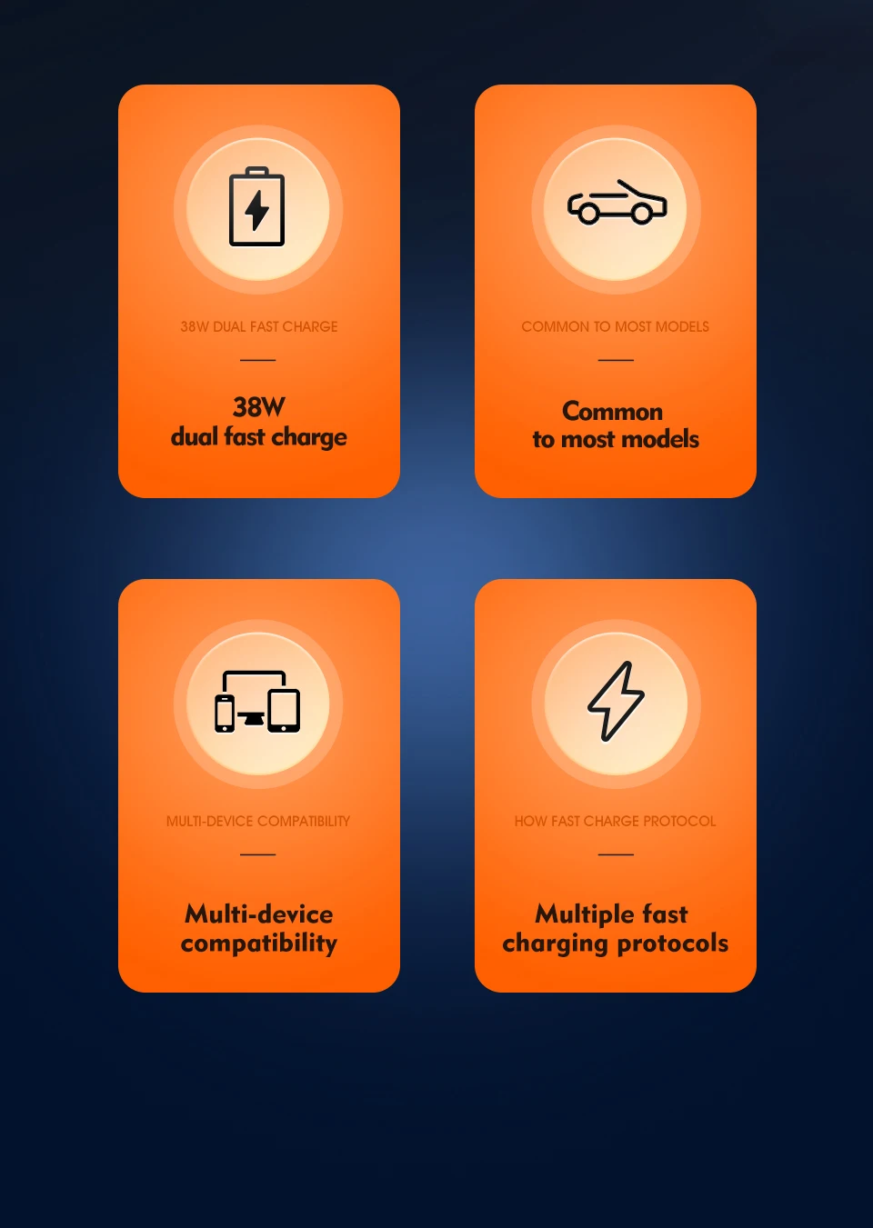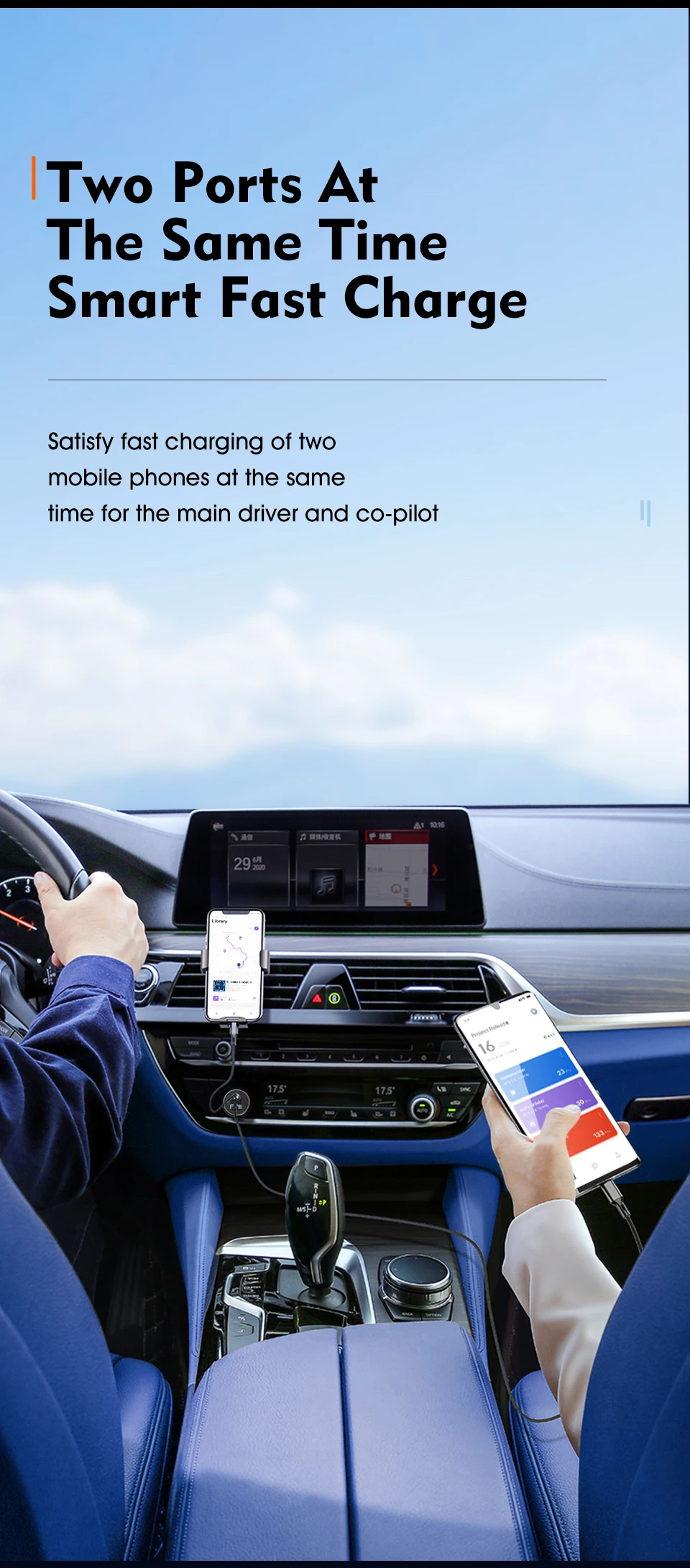 Fast charging, at the same time two phones are charging. Easy illumination of ports.