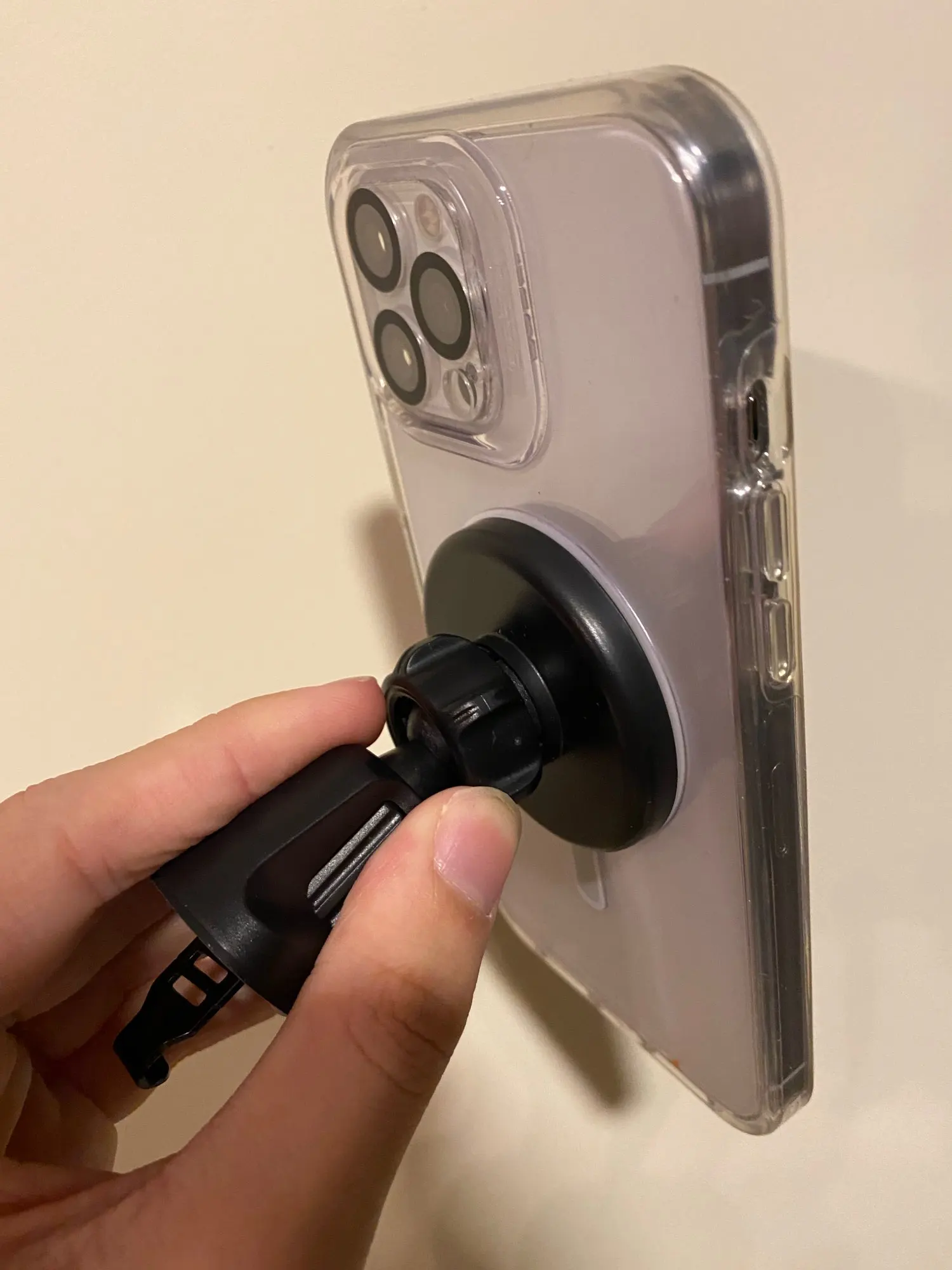 Amazing product! Works perfectly with magsafe cases … Strongly holds the phone and it perfectly fits in the car!