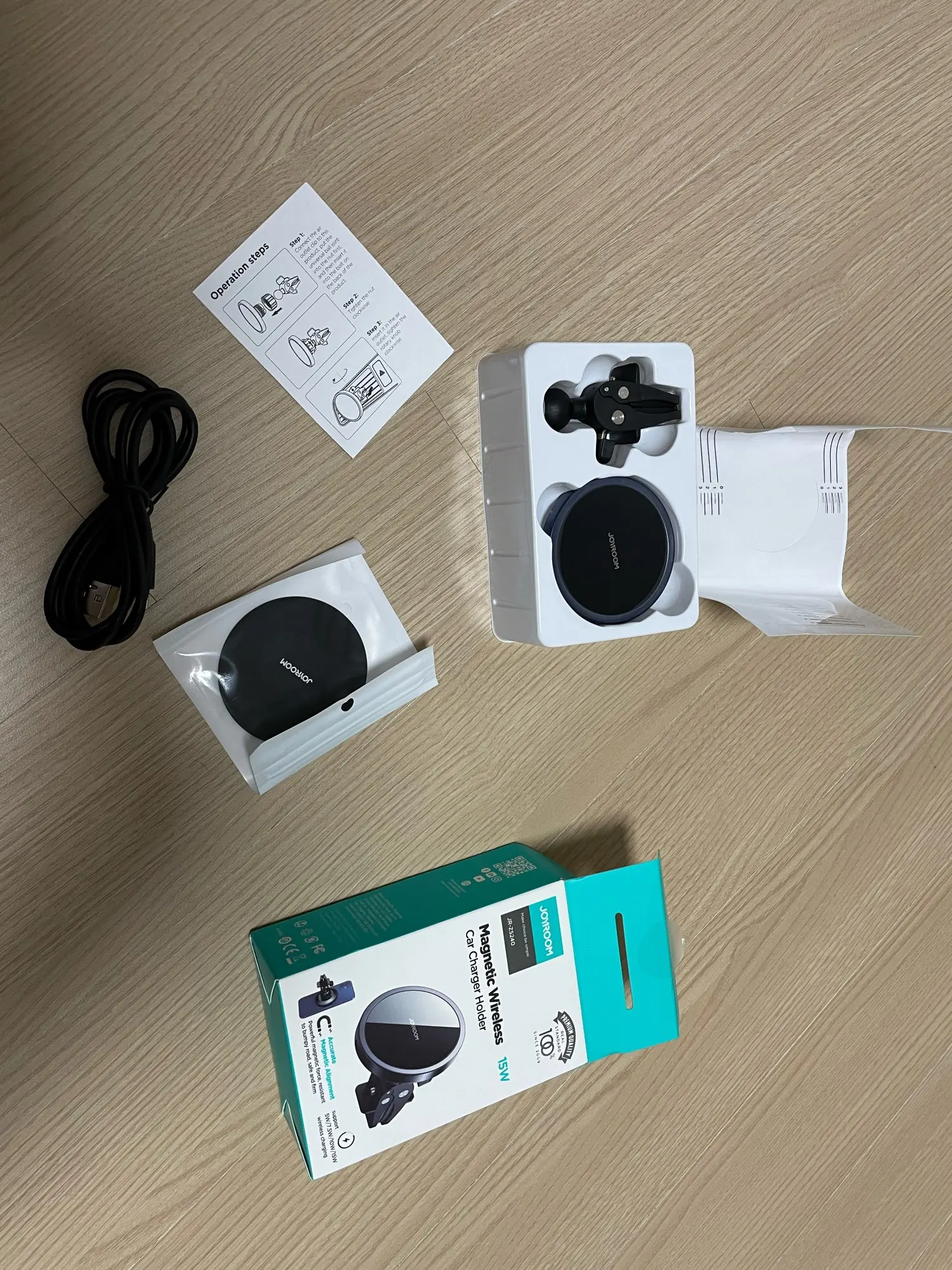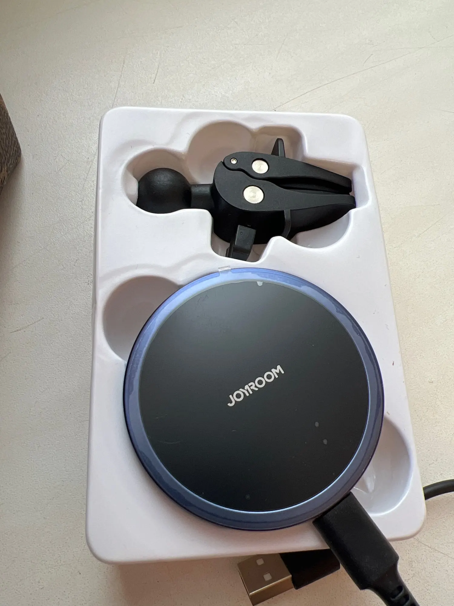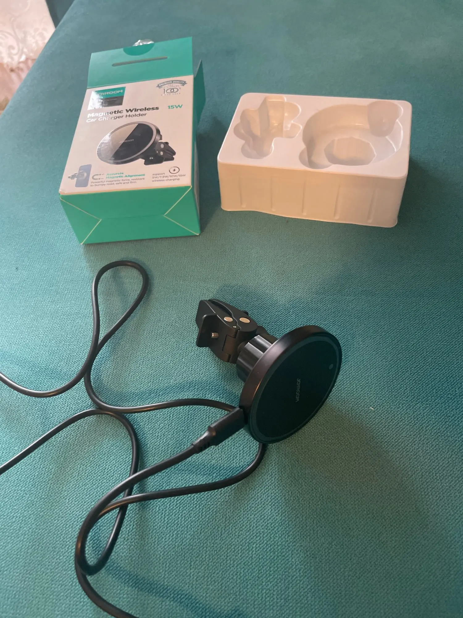 Fine phone holder for car with magnet and cable should. All complete and tidy delivered in a carton. Works top and magnet is very strong happy. Fat happy, have another loose magnet of JoyRoom ordered also for mn friend.