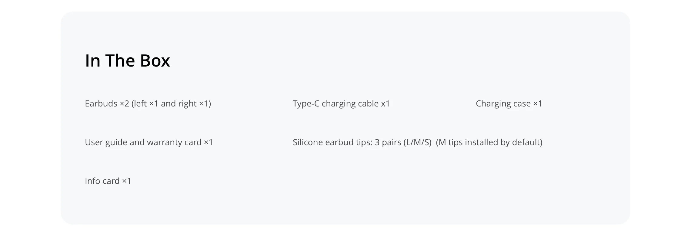 Earbuds ×2 (left ×1 and right ×1) / Type-C charging cable x1 / Charging case ×1 / User guide and warranty card ×1 / Silicone earbud tips: 3 pairs (L/M/S) (M tips installed by default) / Info card ×1