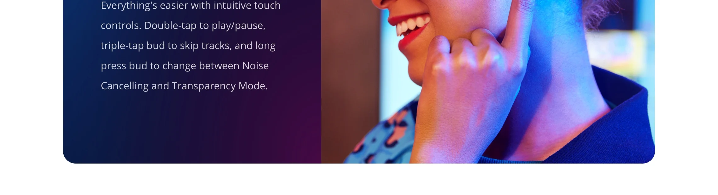 Everything’s easier with intuitive touch controls. Double-tap to play/pause, triple-tap bud to skip tracks,