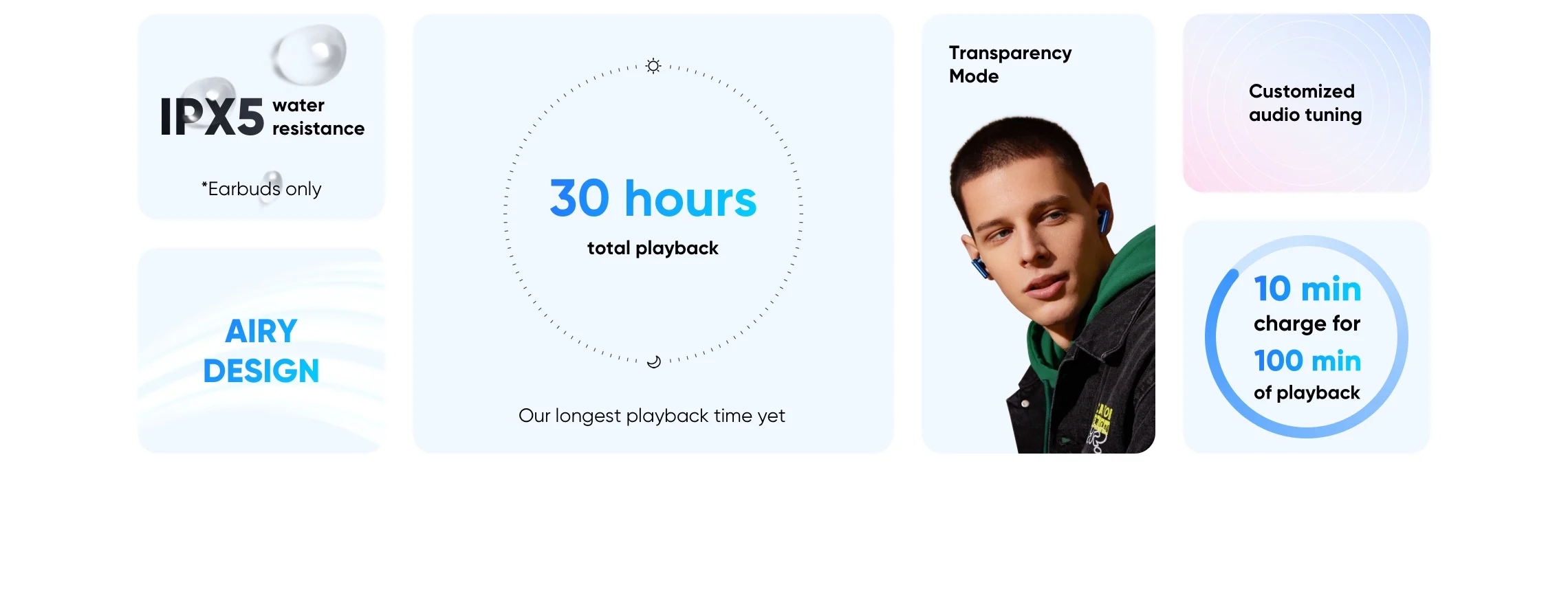 IPX5 water resistance | Airy Design | 10 min charge for 100 min of playback