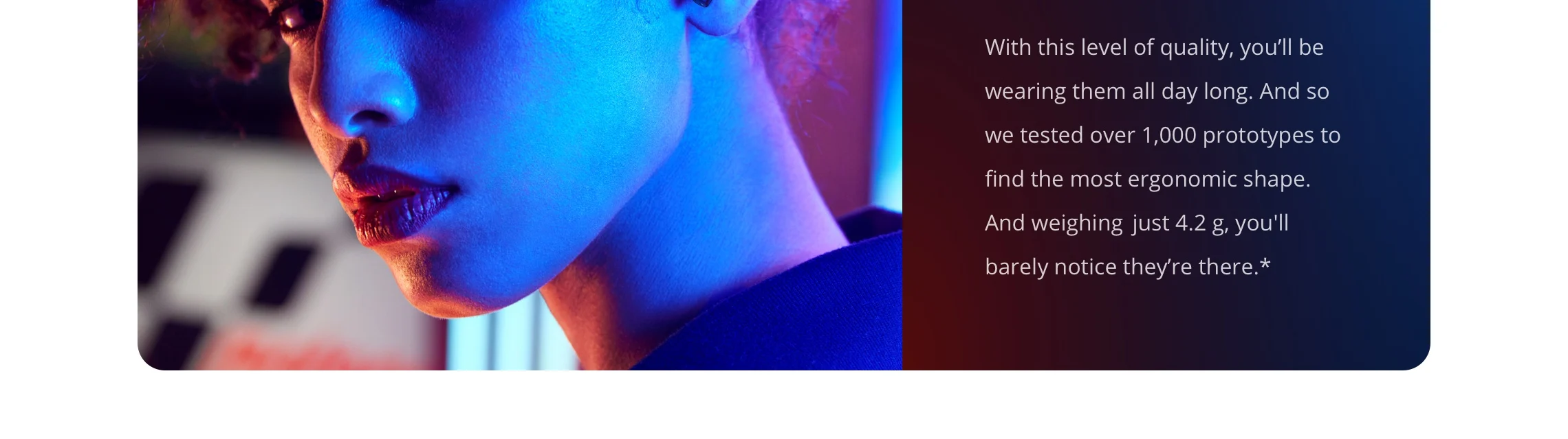 With this level of quality, you’ll be wearing them all day long. And so we tested over 1,000 prototypes to find the most ergonomic shape. And weighing just 4.2 g, you’ll barely notice they’re there.*![]()