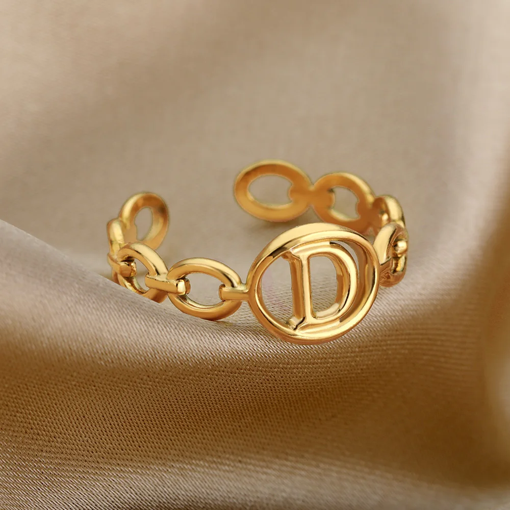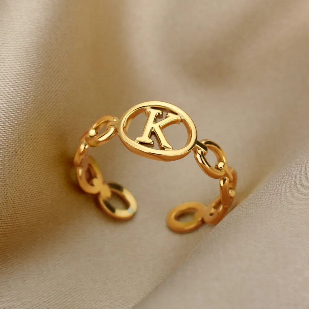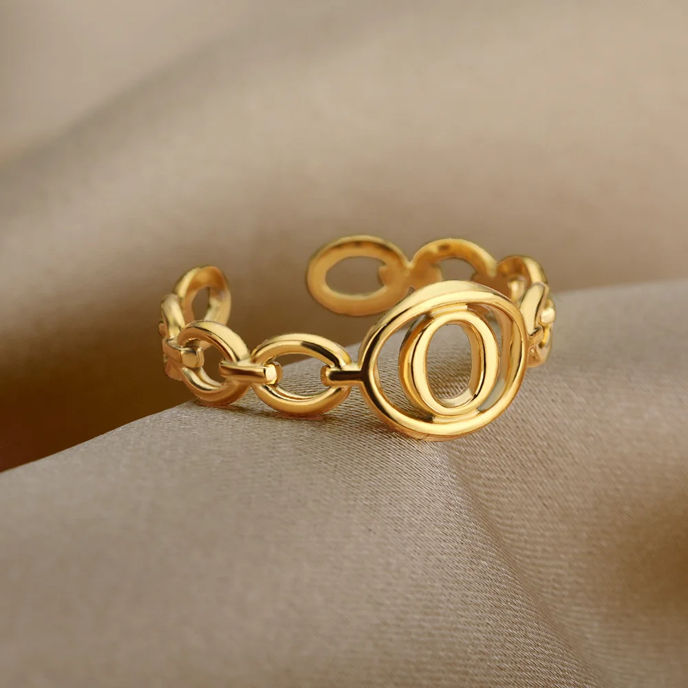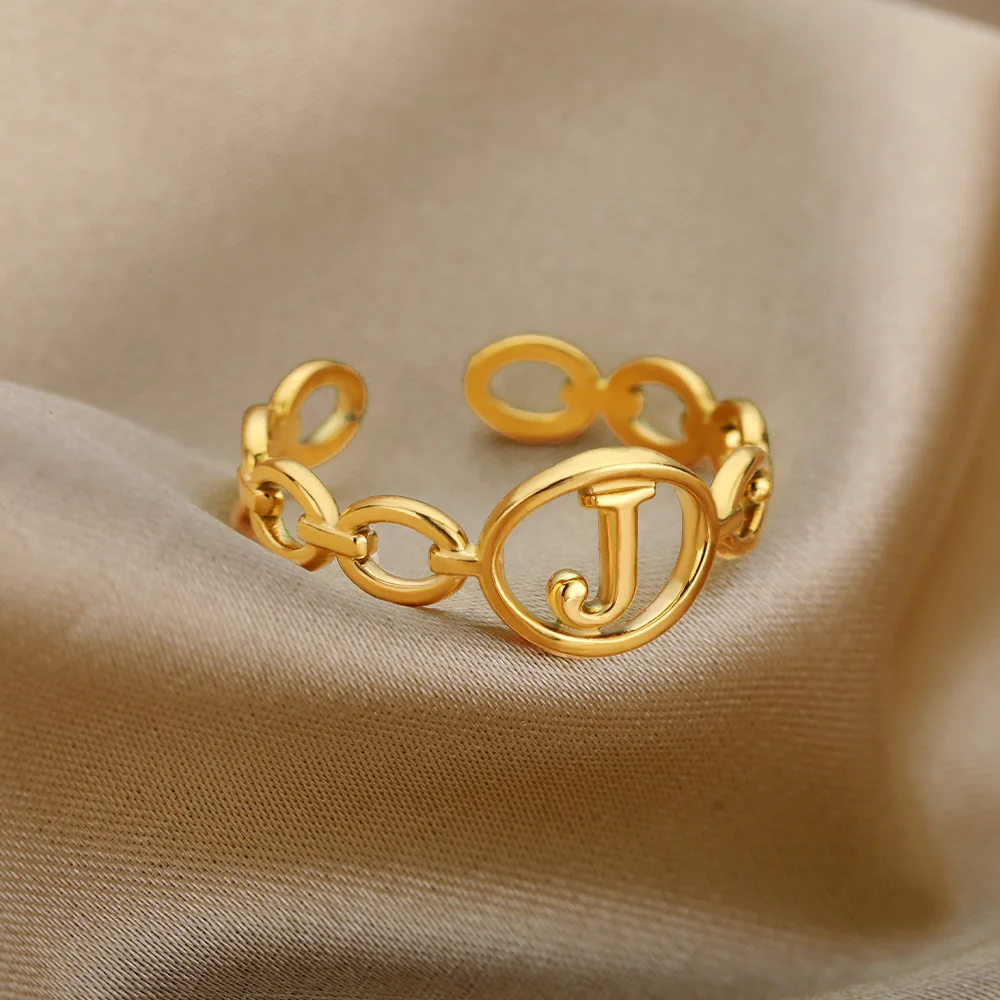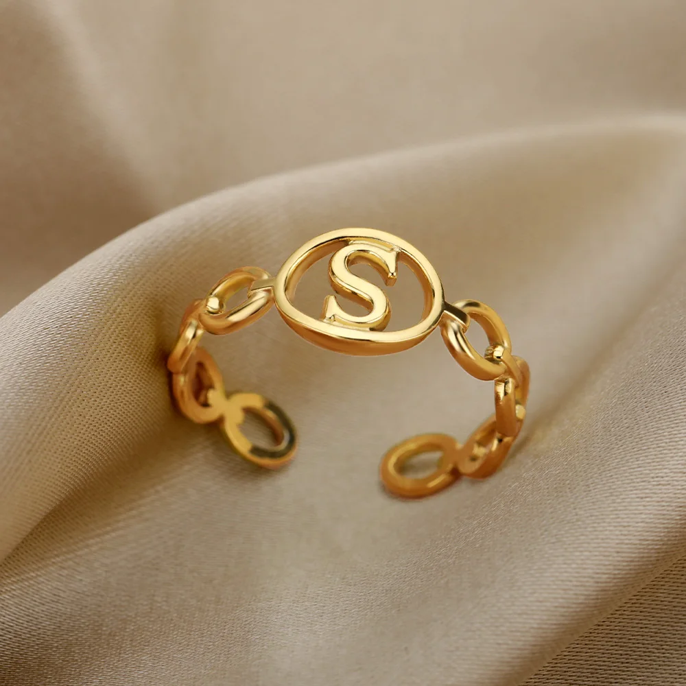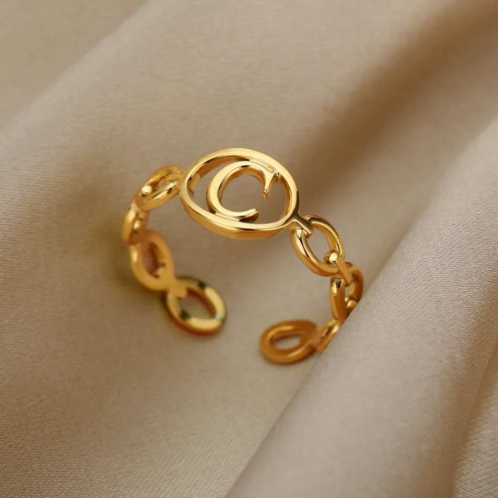Initial Letter Stainless Steel Gold Cuban Adjustable Ring