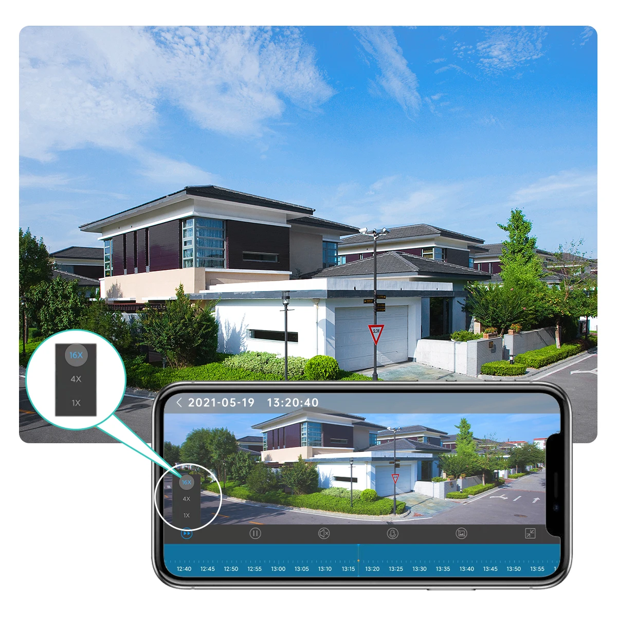 You can monitor your home in all directions. No angle can be out of the surveillance. Digital zoom (4x) function allows you to zoom in to see more details and zoom out to see the entire field of view.