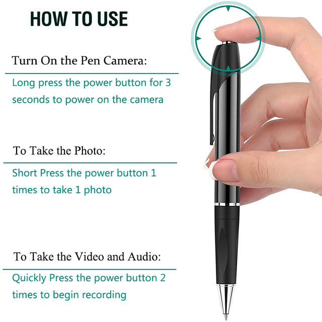 Answer: The pen camera designed like a normal pen, just switch the power button, and it will record automatically.