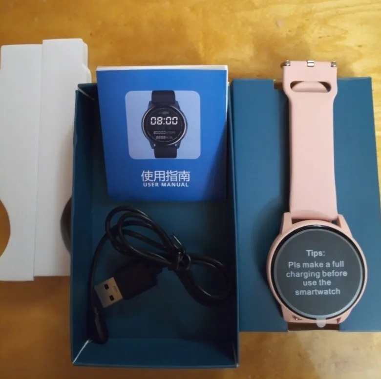The smart watch came as described.Very fast shipment, delivery took about 20 days in excelent condition in the colour I ordered.Comfortable when wearing.I downloaded the app for pairing with the phone easy and it took a few minutes.Haven't used all functions yet, but seems it will do a great job for that money.I'm satisfied and recommend the item and the store.The user manual is in English and Chinese.Love the wach.