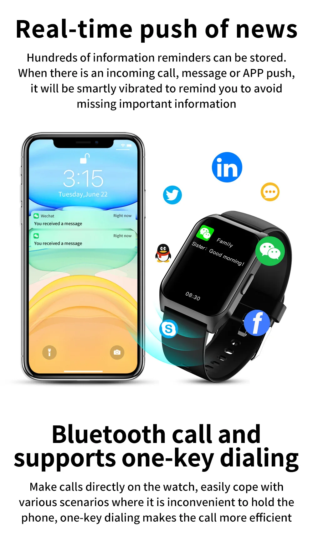 Message notification: call reminder, SMS, QQ, WeChat, Dingding, Wangxin, Sina Weibo, lnstagram, linkeln, Snapchat, Tumblr, Facebook, Skype, Twitter, WhatsApp, Line, KakaoTalk, etc.