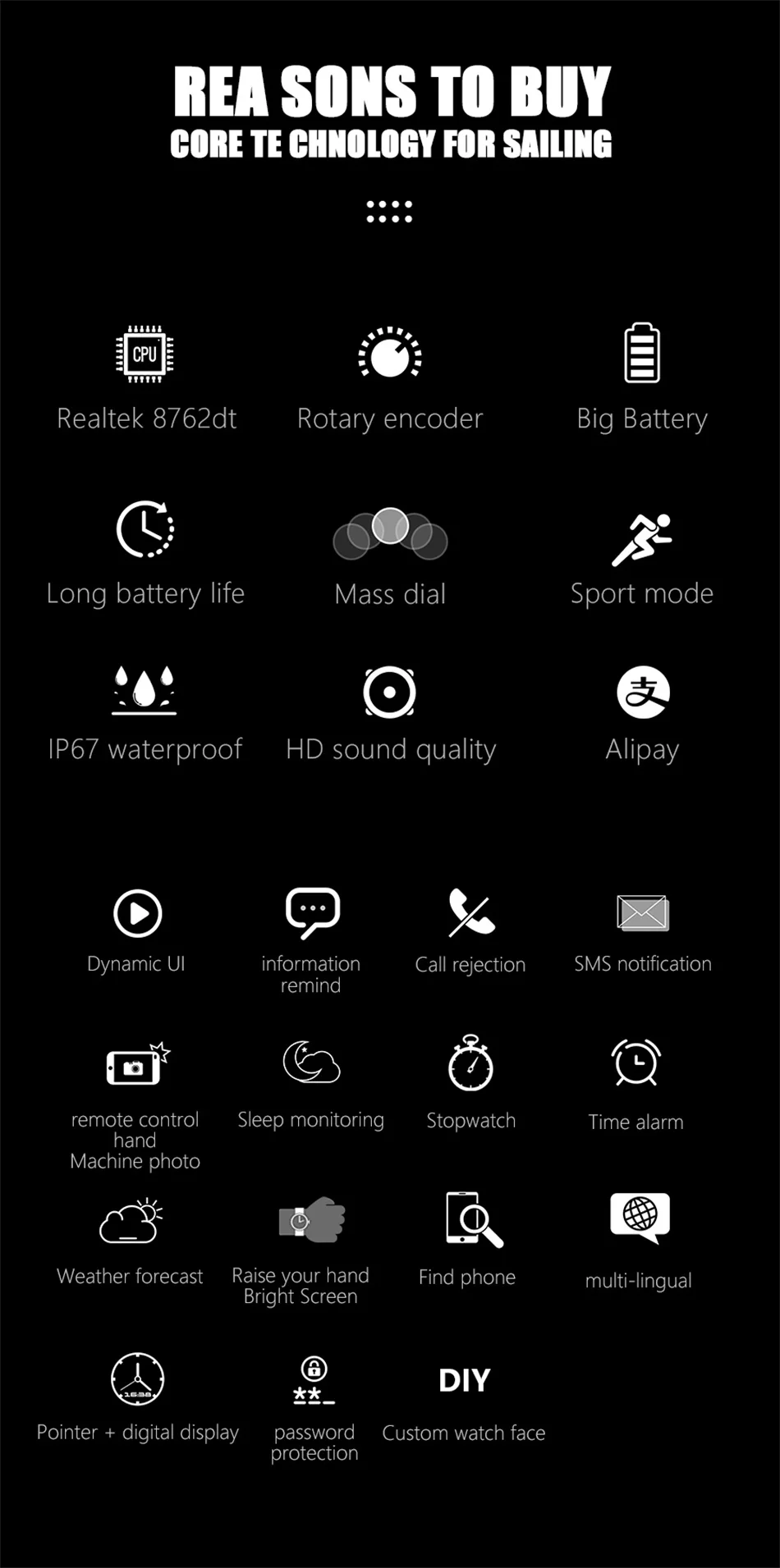 * Timer, Pedometer, Calorie Consumption, Distance Calculation, Heart Rate, Blood Pressure, Blood Oxygen, Sleep Time / Quality, On & Off dispaly, Multiple sports modes