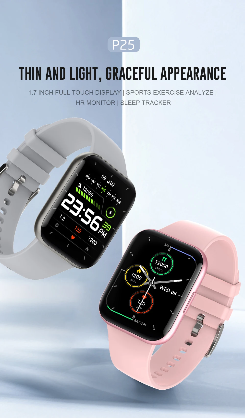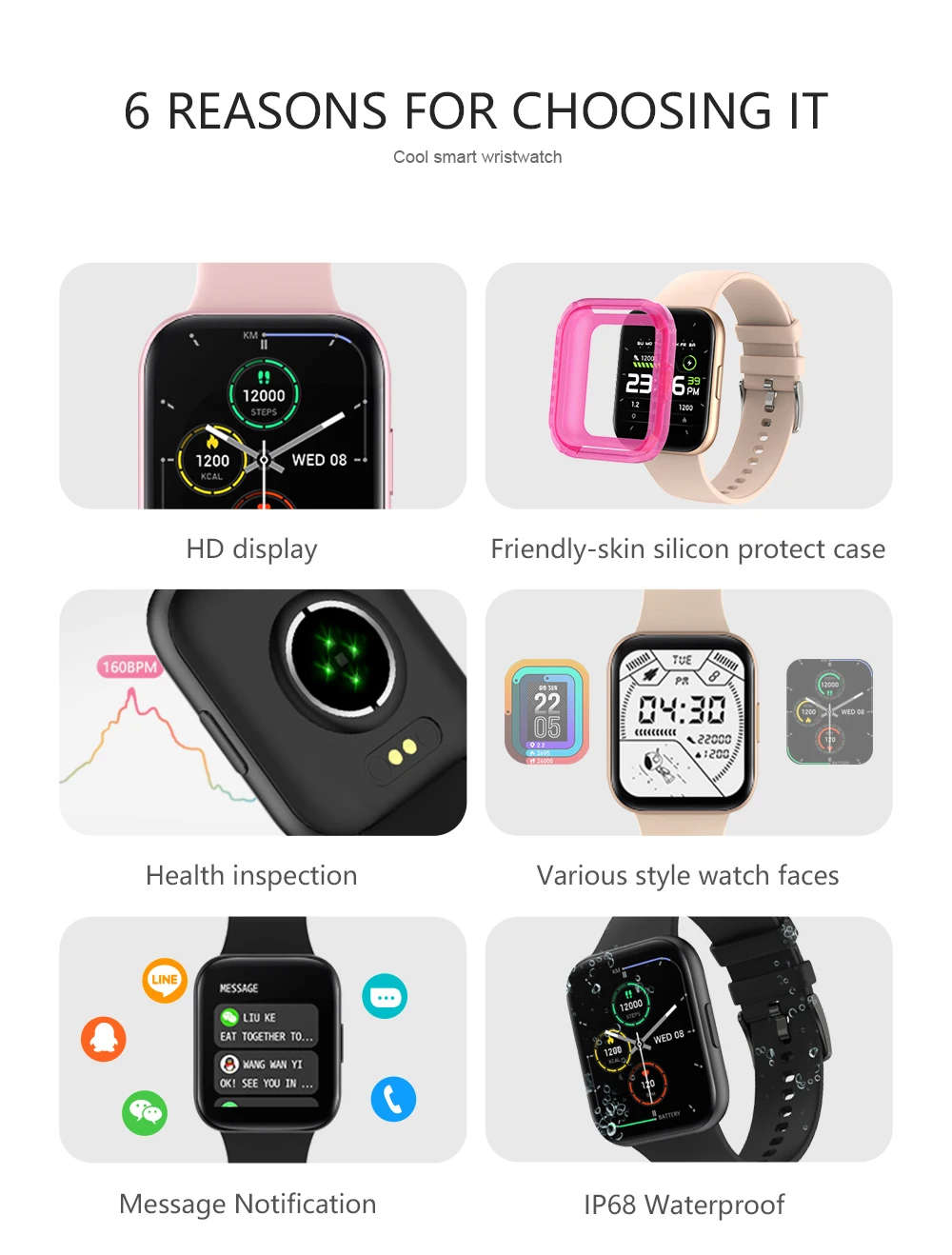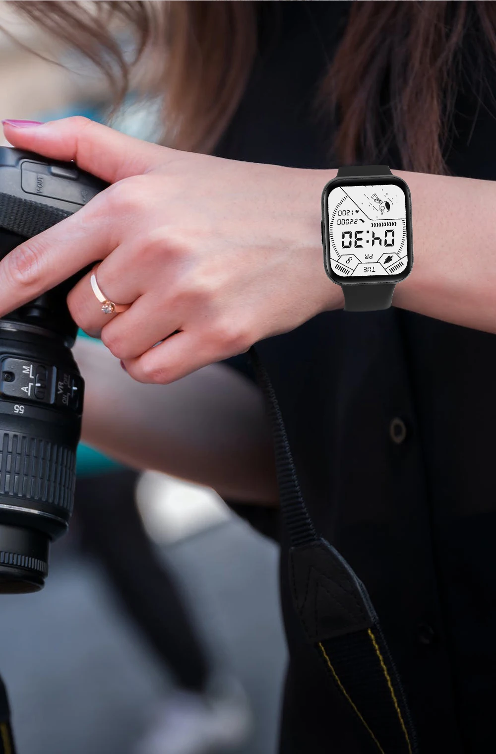 Watch is not for show-off. Probably for sports, work, etc. The material of the strap is very comfortable. From a sharp turn with a brush, the display is turned on for a pre-selected time. You can choose the cover plus add from the proposed one.