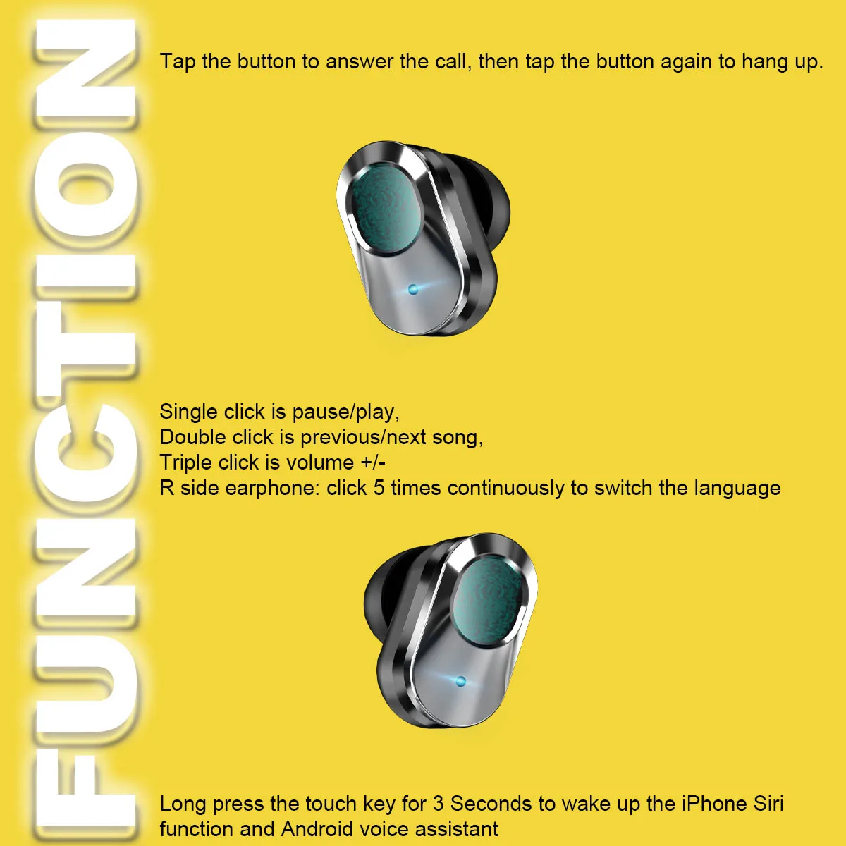 7: Support local memory storage play, Bluetooth music play, TWS music play.All in ear wear, perfect high and low sound quality, handle design, painless and comfortable, It adopts stable RTL 8753bfr dual transmitter, regardless of master and slave, built-in 5.0 double Bluetooth, hifi 6D sound quality, cool breathing light, touch sensor, AI voice, Siri wake-up.