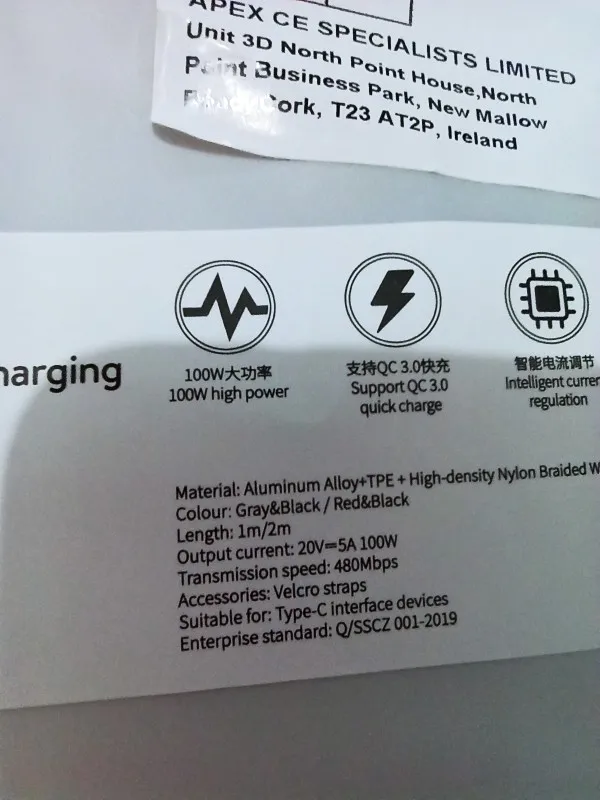 Delivered in 16 days. Sturdy cable, 1 MT, the Velcro is fixed on cable body to hold to curl. Type-C on both ends. Works on my bike G7 plus. Recommend enough, baseus is congratulations on product quality and delivery.