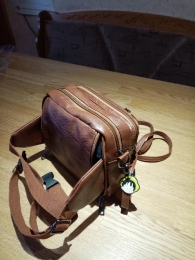 The handbag is very very cool,, with a bunch of pockets-under the valve and over it, two compartments and in a large pocket with a zipper. Can be worn over the shoulder and on the belt. The design is good, sewn neatly, that would still be more efficient for leatherette. I will definitely wear it with pleasure! As a gift, a small keychain is a surprise, thank you.