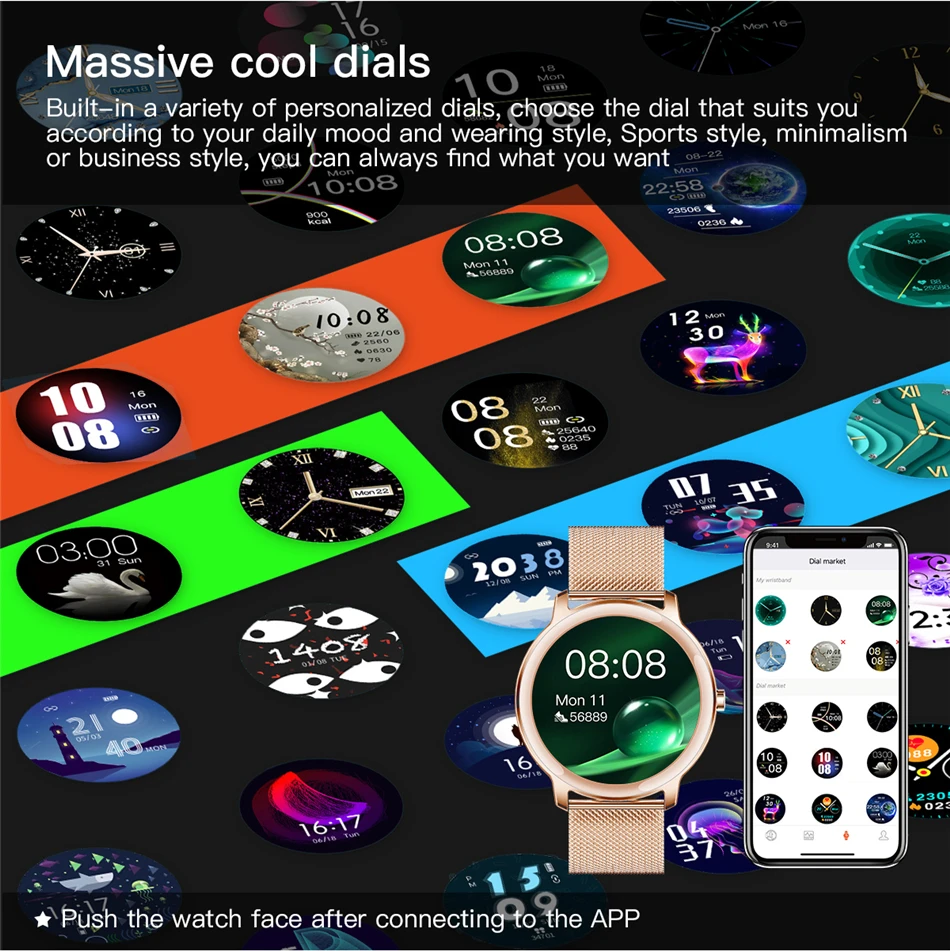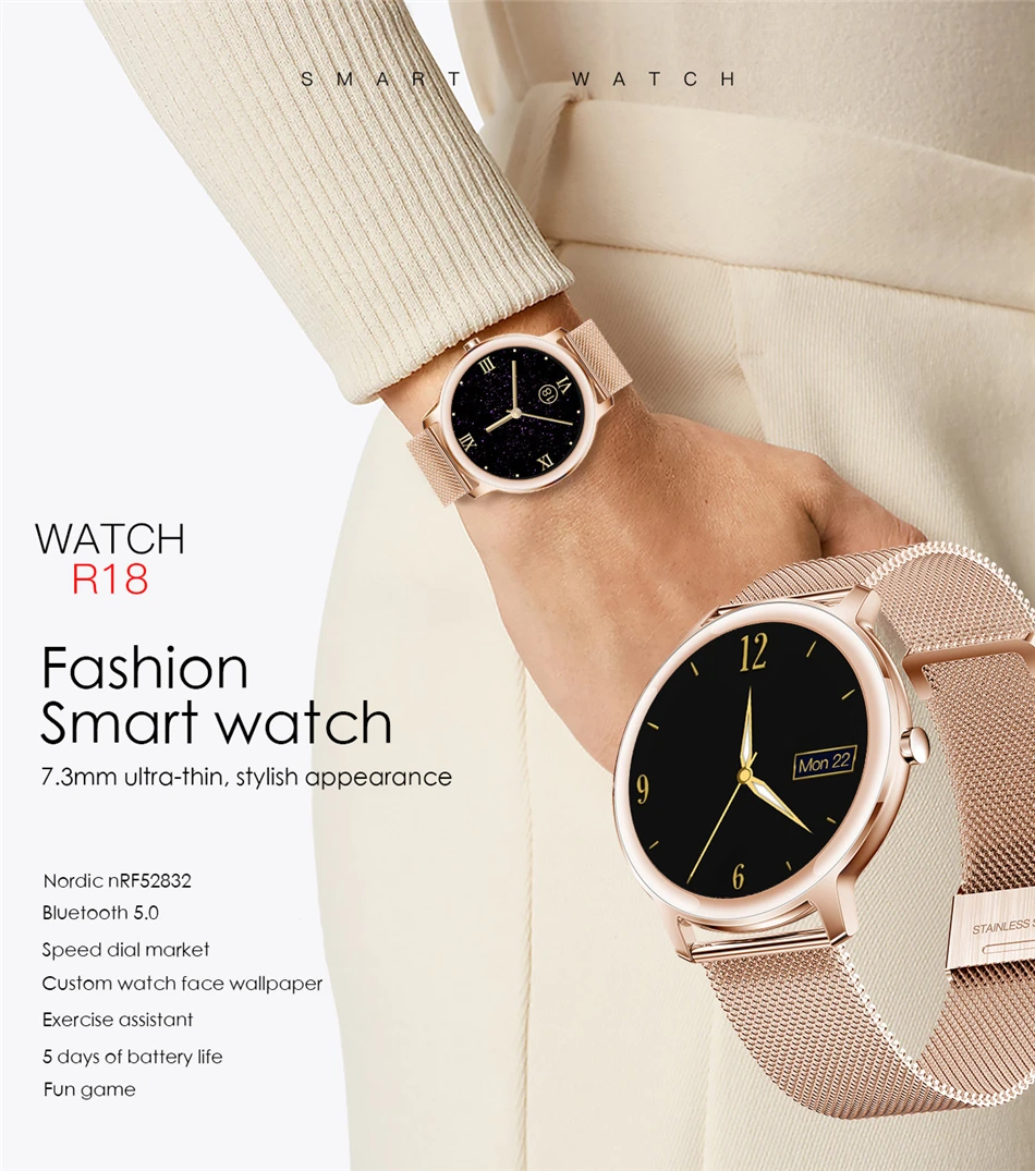 The watch is very stylish, thin. Dimensions as in the description of the store. Pulse, oxygen, pressure measures close to accurate. Delivery is super fast, to Belarus in 3 weeks.