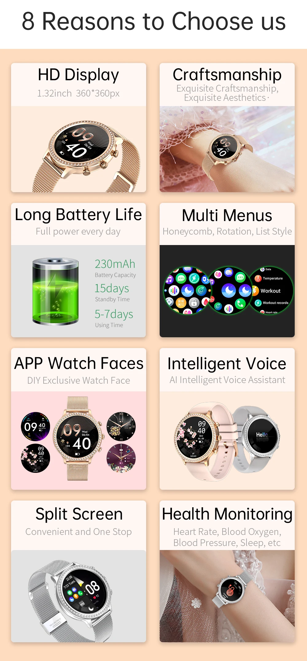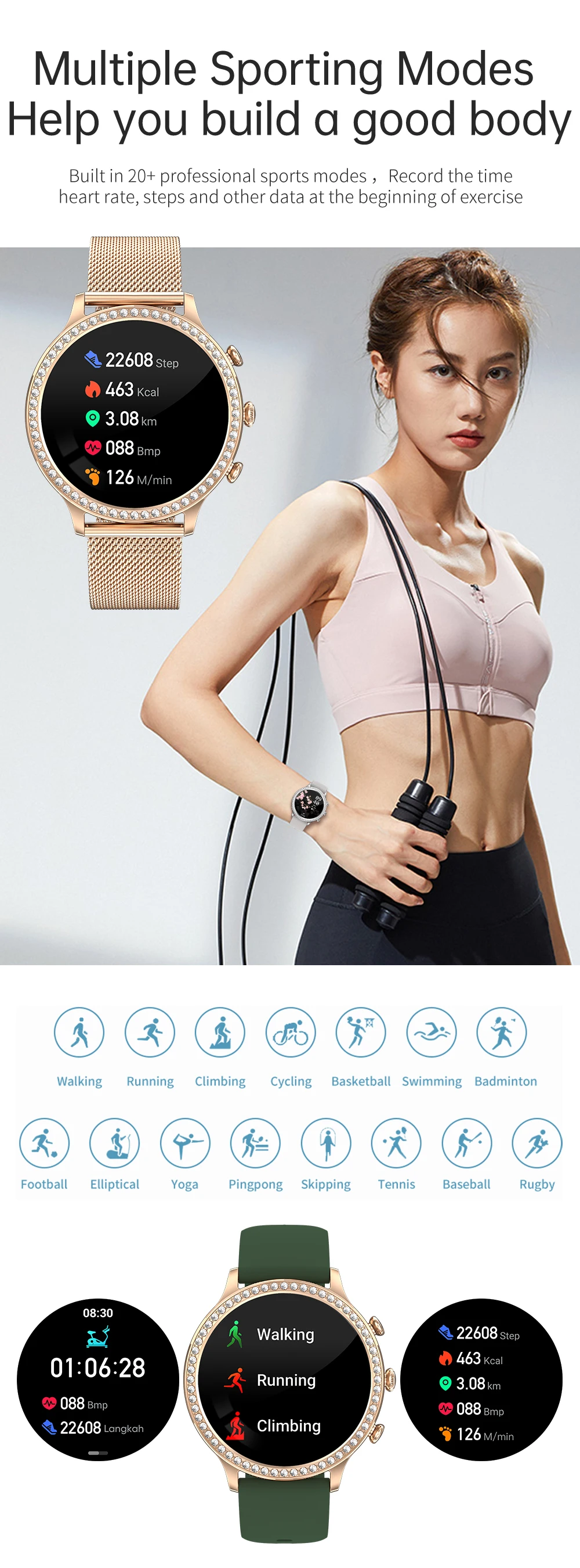 Receive/Reject phone calls/ Dial phone call, Heart rate monitoring, Blood/Blood oxygen pressure monitoring, Sleep monitoring, Sedentary reminder, Sports pedometer/calorie consumption/track record/exercise time, Call reminder and display, Message is pushed and displayed, Remote control camera, Automatically heart rate measurement, Multi-Sport measurement, Clock reminder, Alarm reminder,4 kinds of dials default. APP customized watch faces are optional